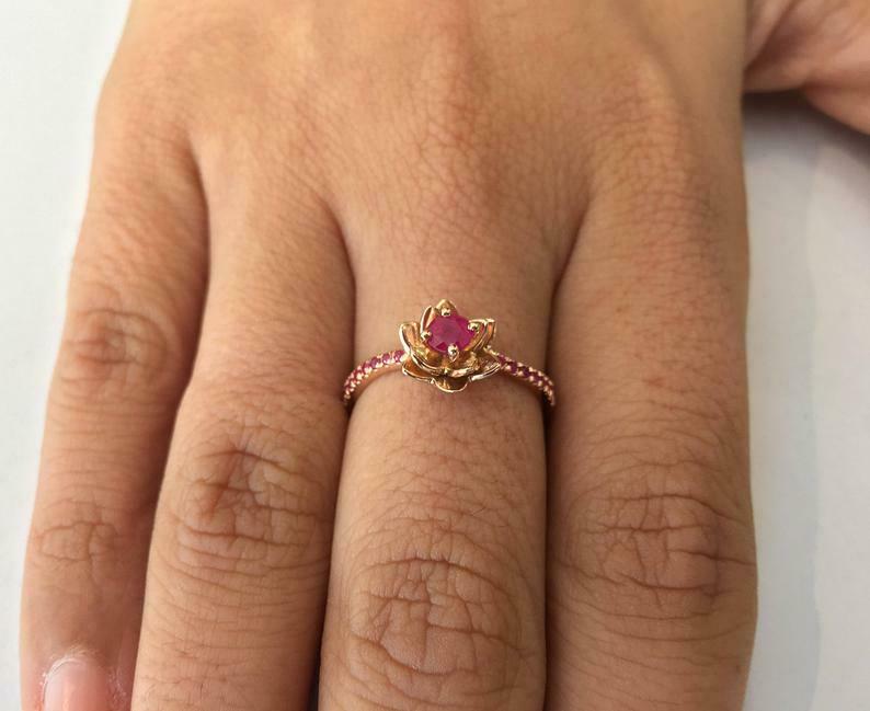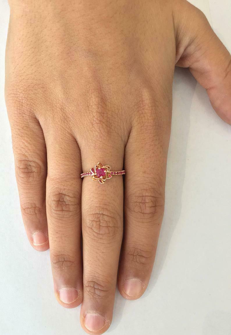 1ct Round Cut Pink Ruby Flower Solitaire with Accent Ring 14k Rose Gold Finish