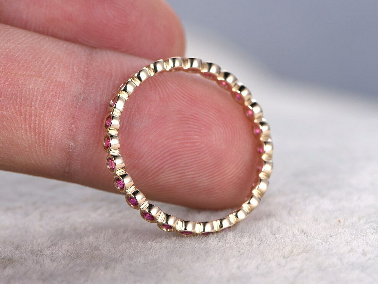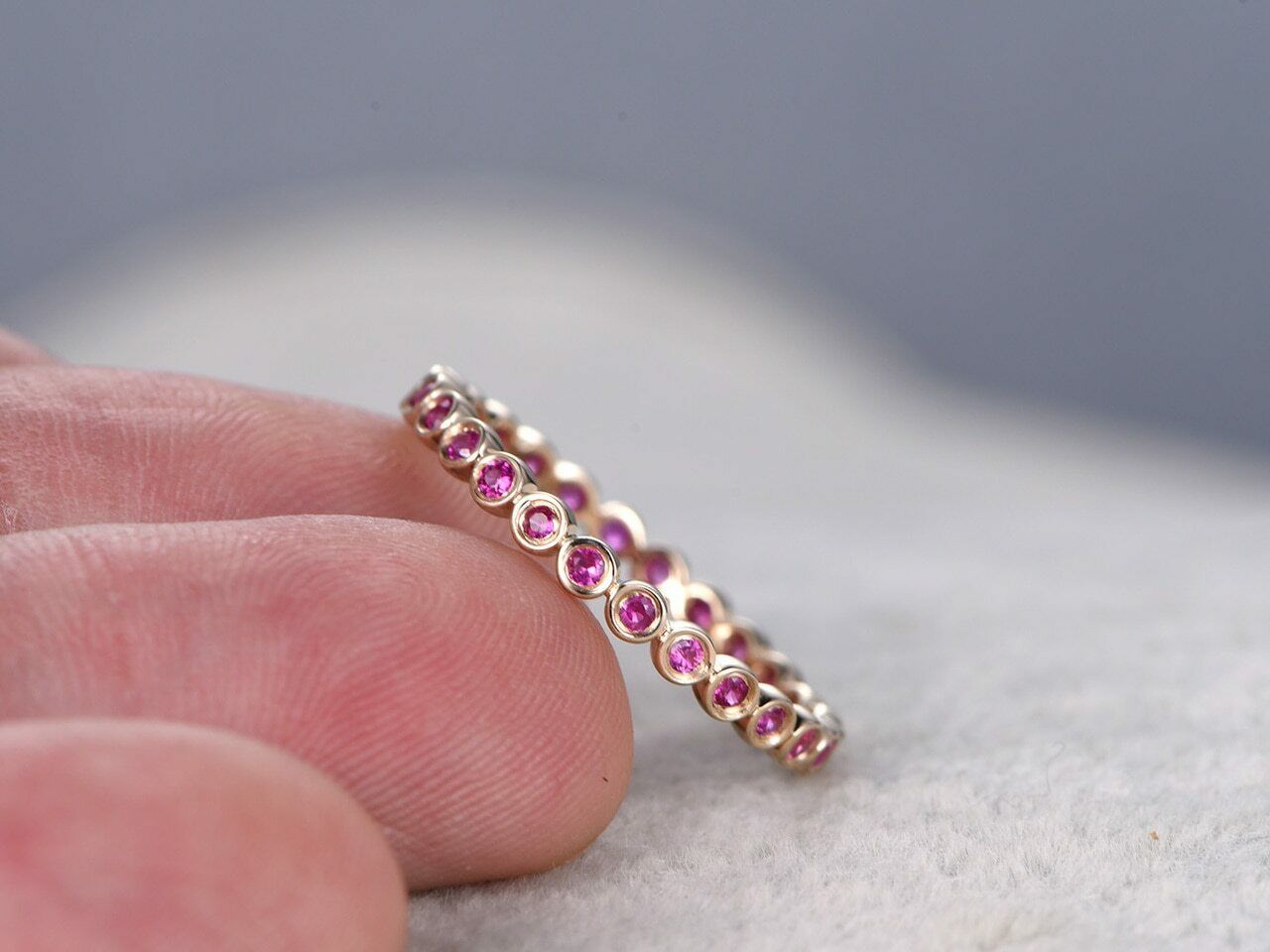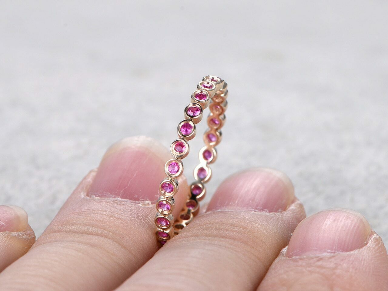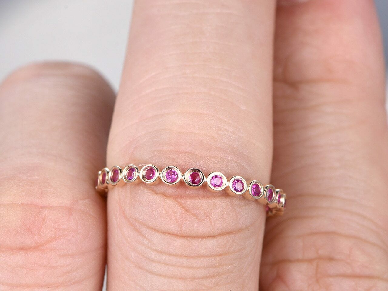 1ct Round Cut Pink Sapphire Wedding Band Bezel Set Stackable 14k Yellow Gold Over