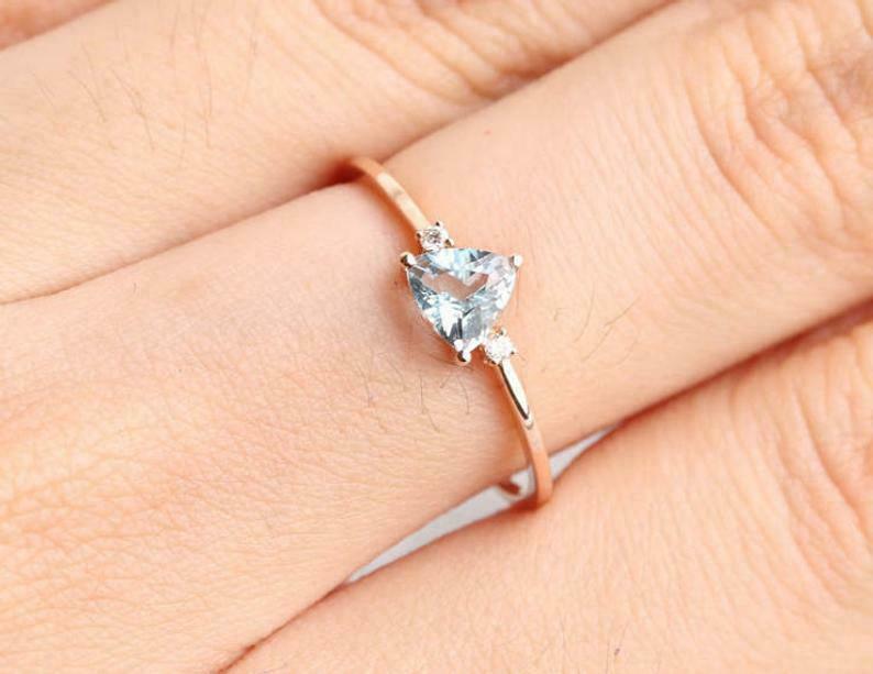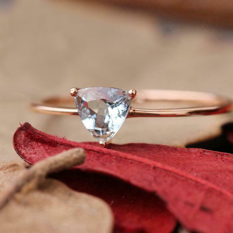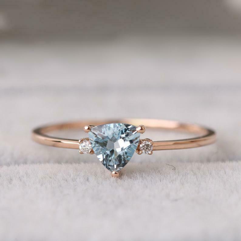 1ct Trillion Cut Blue Aquamarine Engagement Ring Three Stone 14k RoseGold Finish