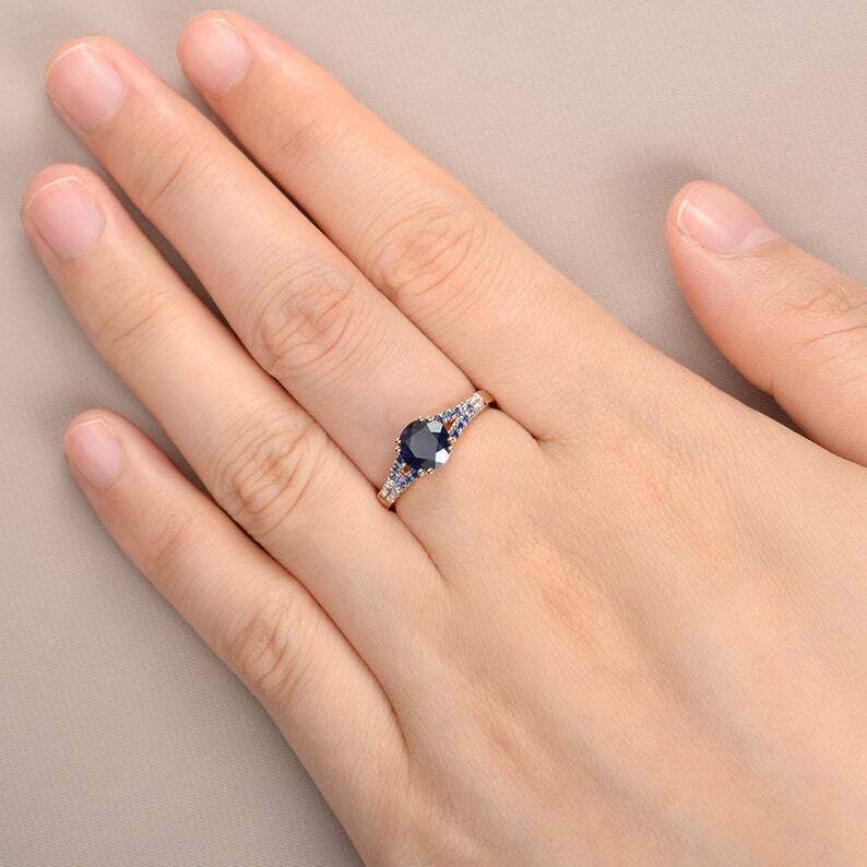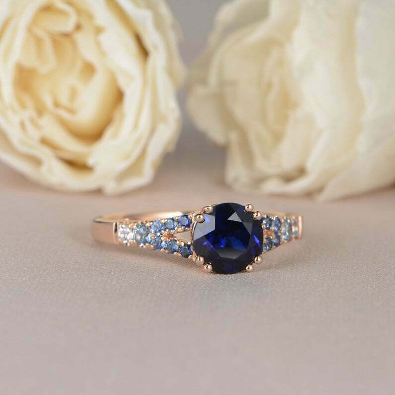 2.1ct Round Cut Blue Sapphire Engagement Ring Split Shank 14k Rose Gold Finish