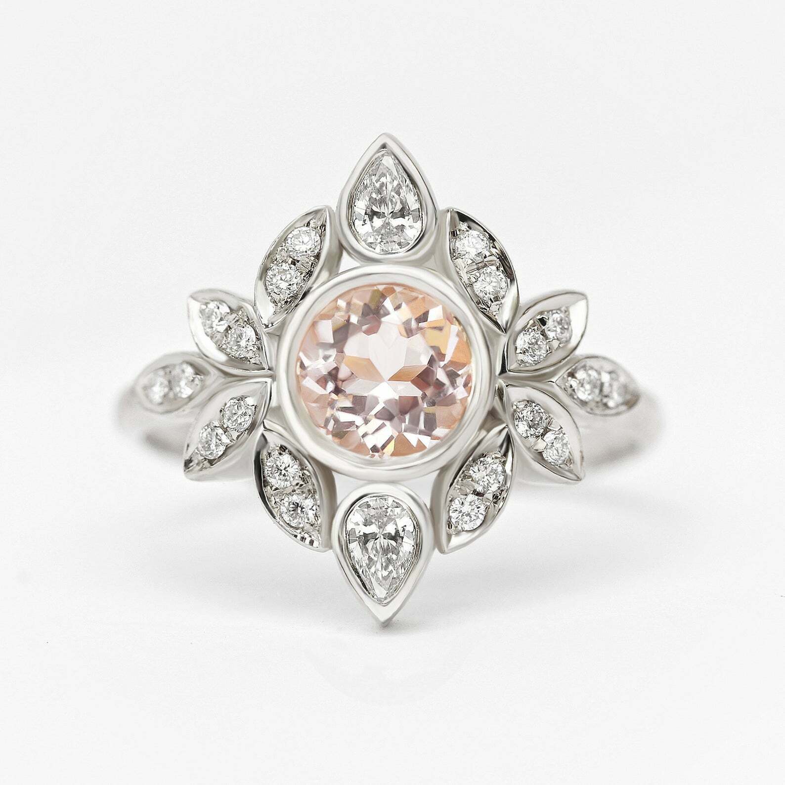 2.25ct Round Cut Peach Morganite Engagement Ring Floral Art Deco 14k White Gold Finish
