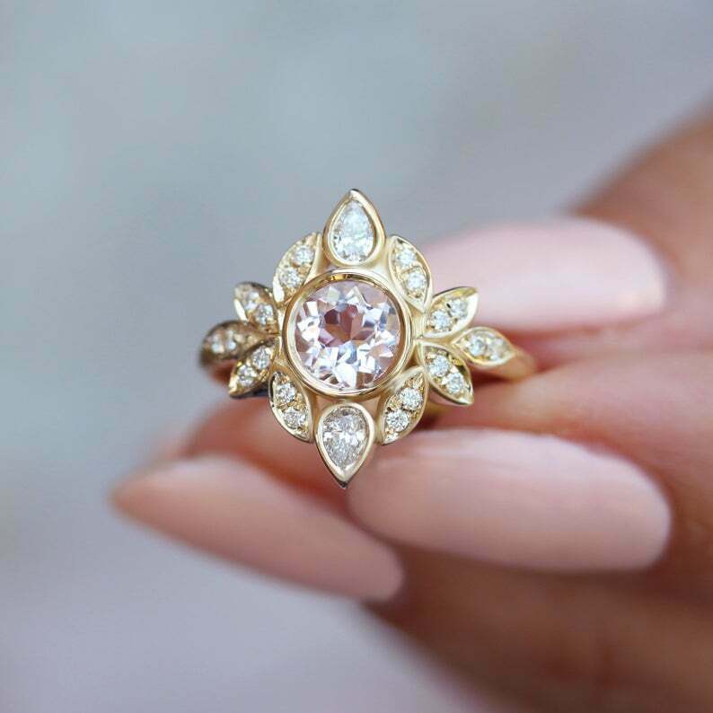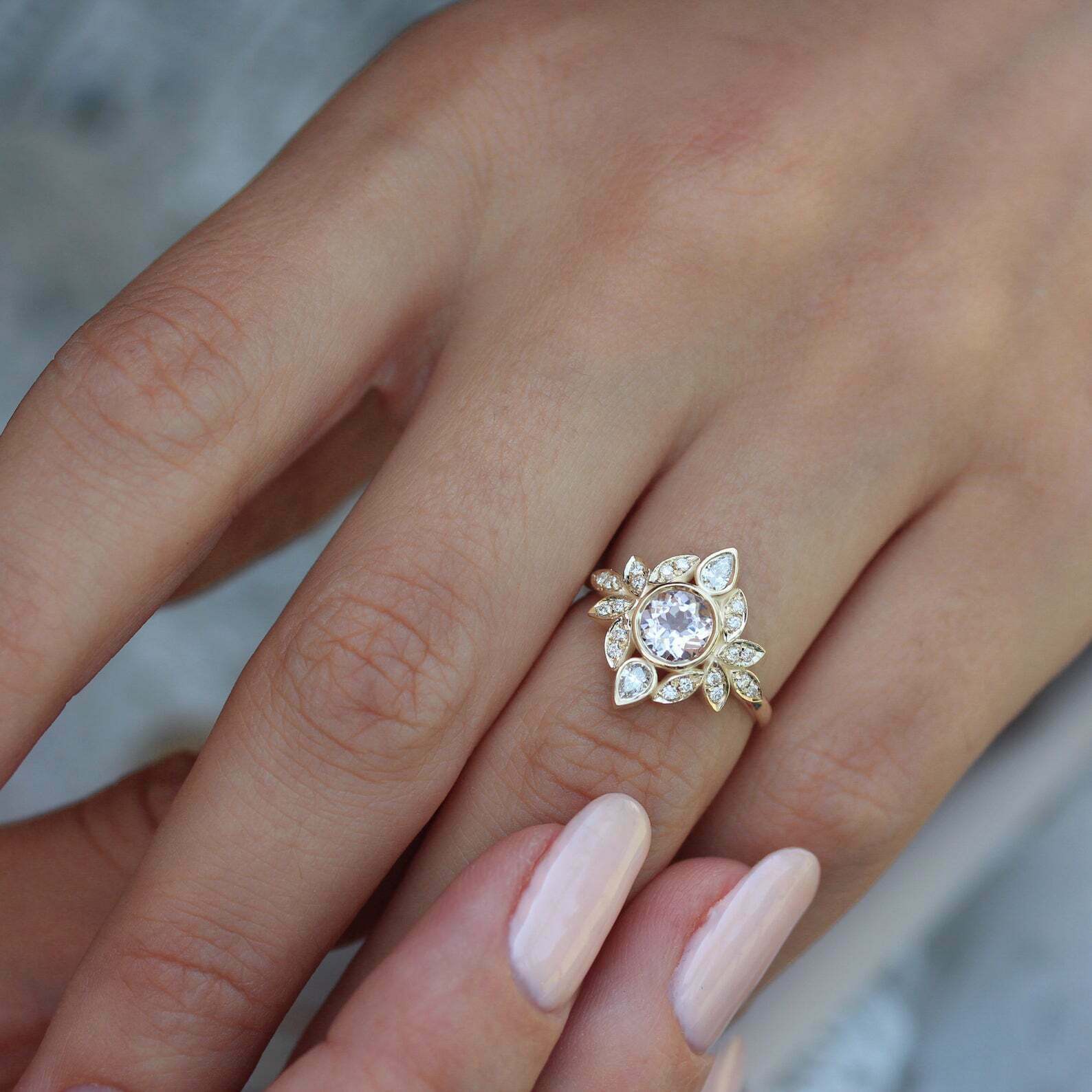 2.25ct Round Cut Peach Morganite Engagement Ring Floral Art Deco 14k Yellow Gold Finish