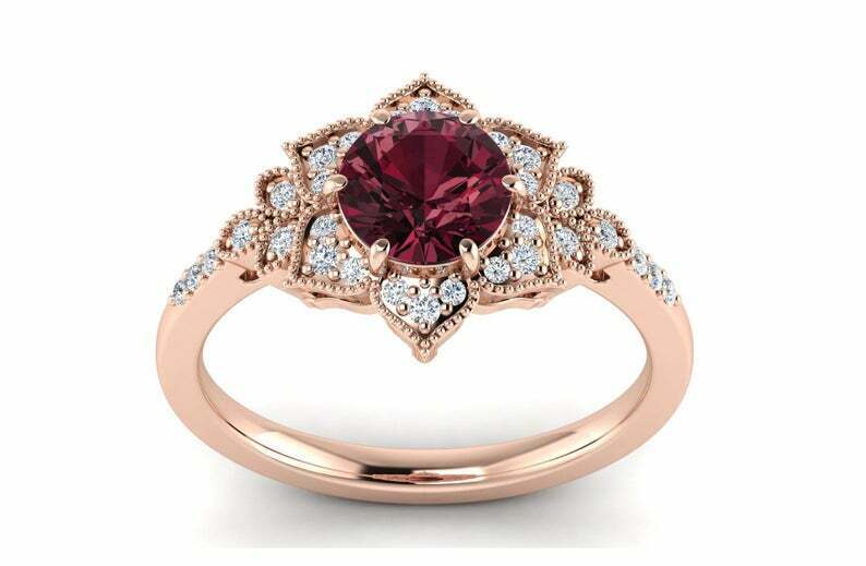 2.2ct Round Red Garnet Flower Milgrain Halo Engagement Ring 14k Rose Gold Finish