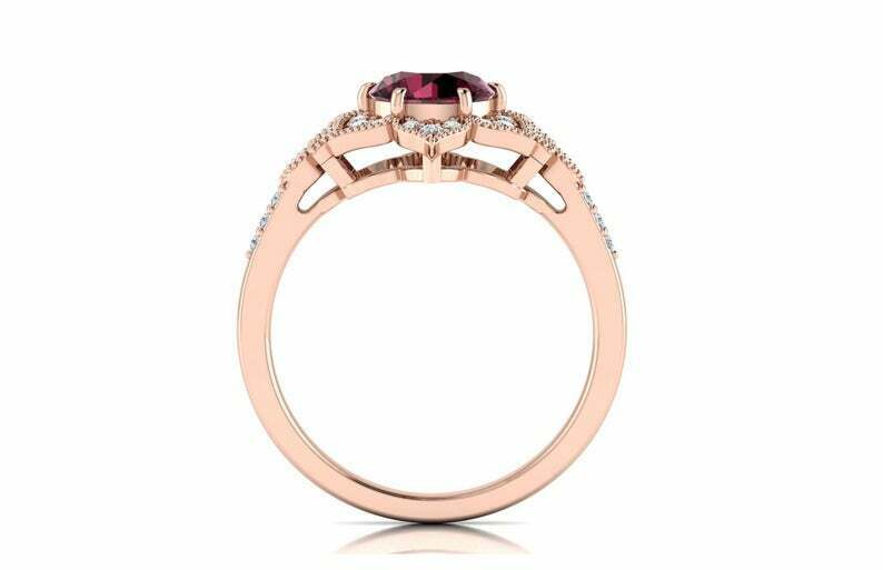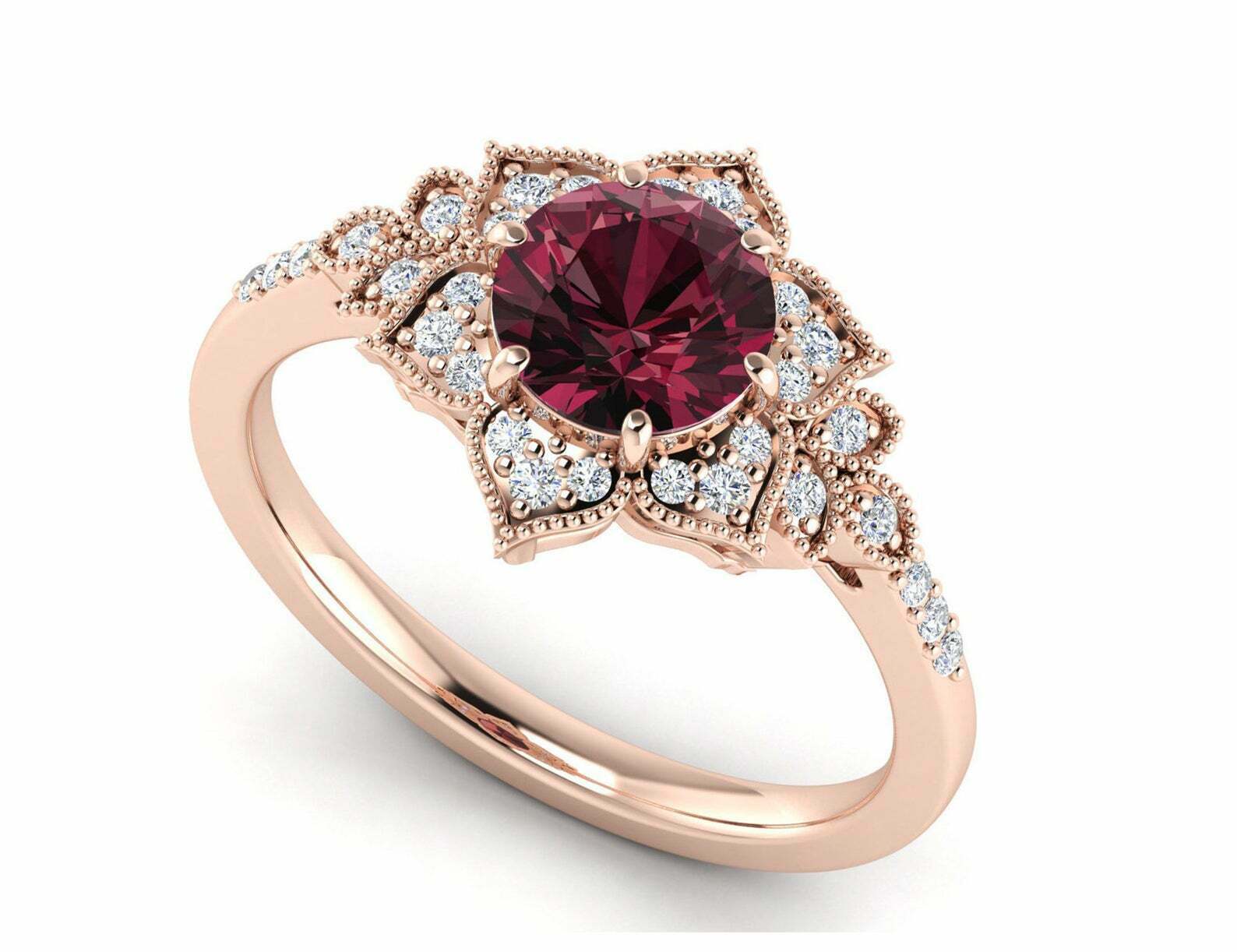 2.2ct Round Cut Red Garnet Flower Milgrain Halo Engagement Ring 14k Rose Gold Finish