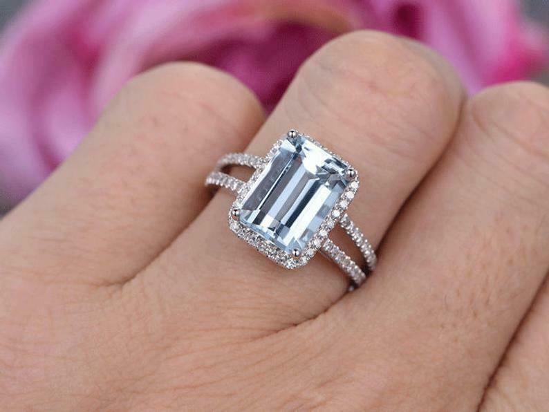 2.3ct Emerald Cut Aquamarine Engagement Ring Split Band Halo 14k White Gold Over
