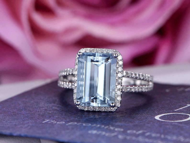 2.3ct Emerald Cut Blue Aquamarine Engagement Ring Split Band Halo 14k White Gold Over