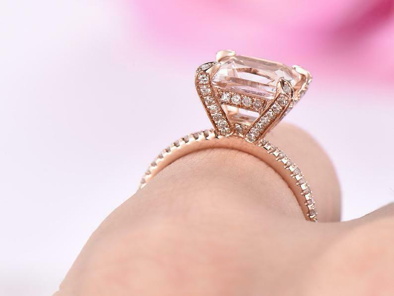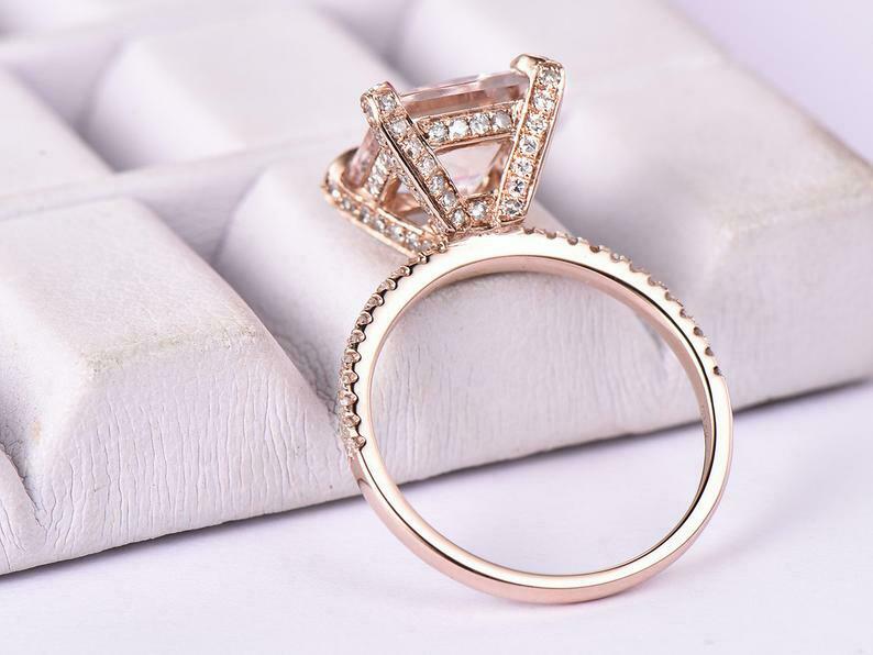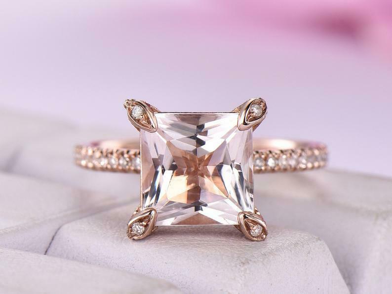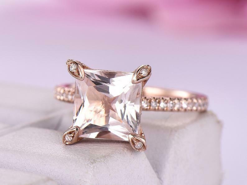 2.3ct Princess Cut Peach Morganite Hidden Halo Engagement Ring 14k RoseGold Over