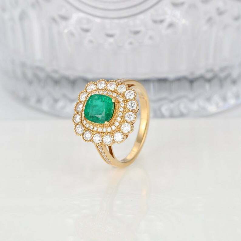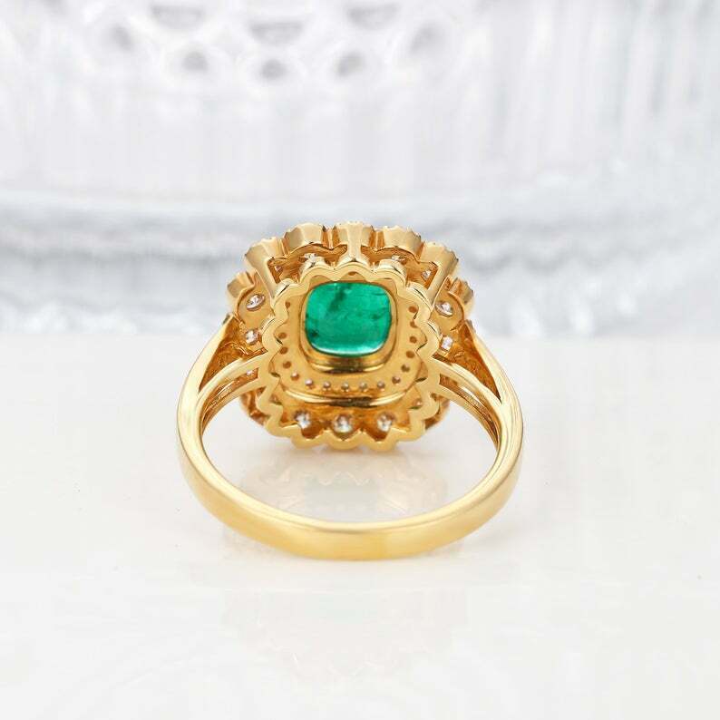 2.5ct Cushion Cut Green Emerald Dual Halo Milgrain Ring 14k Yellow Gold Finish