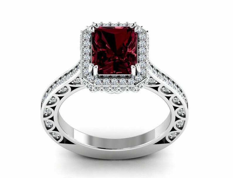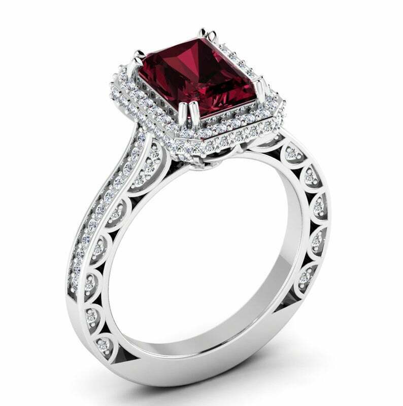 2.5ct Emerald Cut Red Garnet Halo Solitaire with Accent Ring 14k White Gold Over