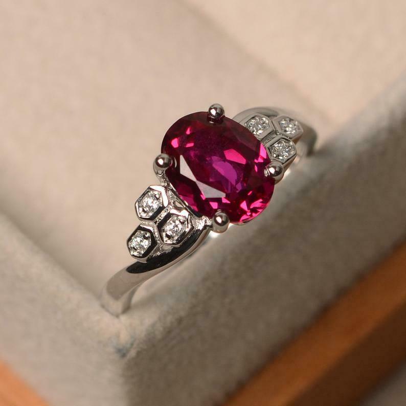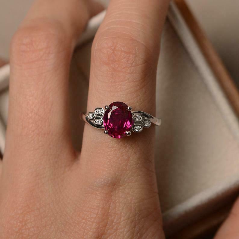 2.5ct Oval Cut Pink Ruby Solitaire Honeycomb Accent Ring 14k White Gold Finish