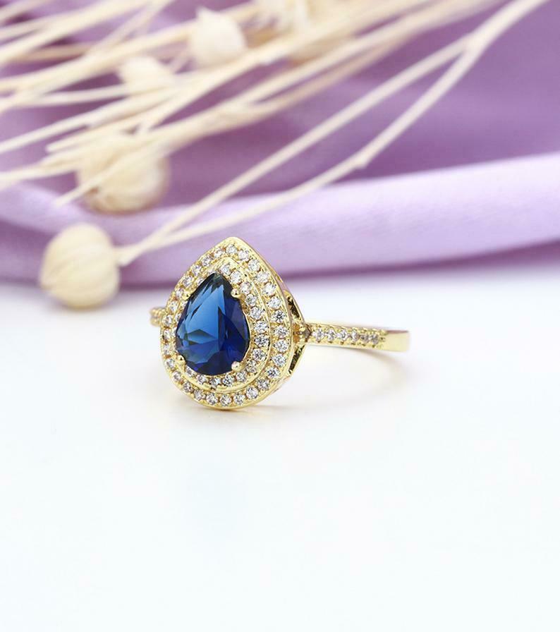 2.5ct Pear Cut Blue Sapphire Engagement Ring Double Halo 14k Yellow Gold Finish