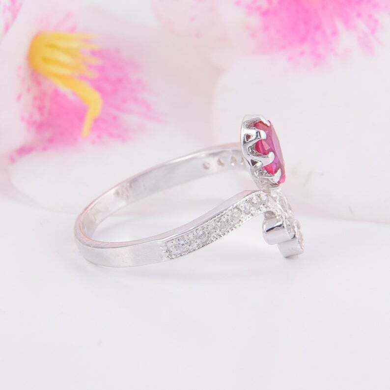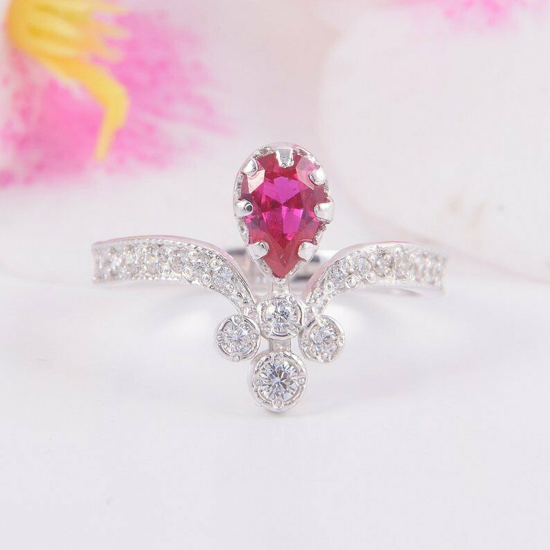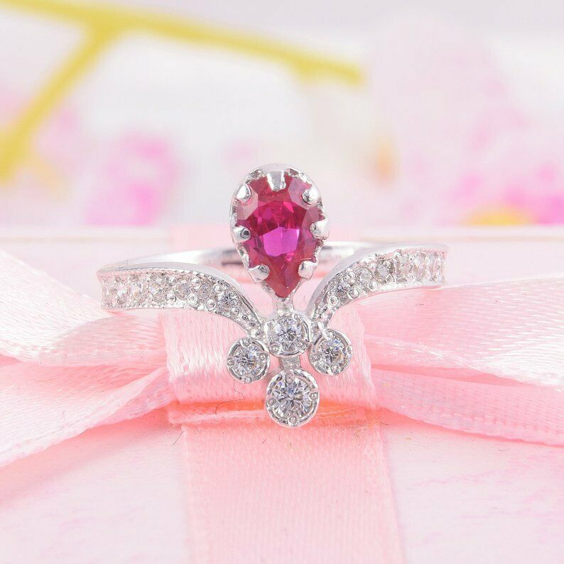 2.5ct Pear Cut Pink Ruby Engagement Ring Crown Curved 14k White Gold Finish