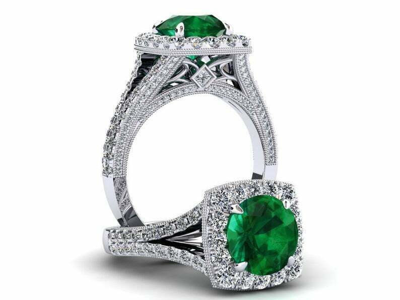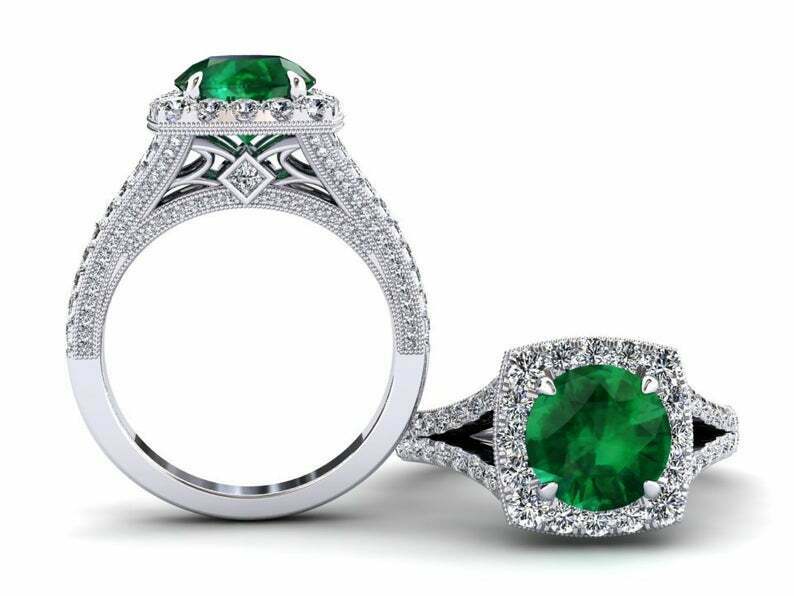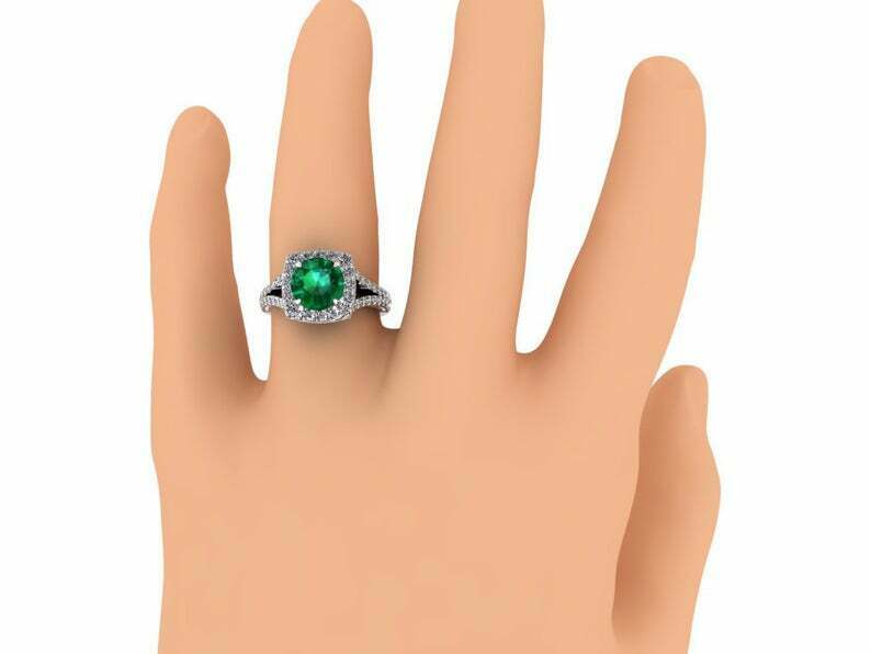 2.5ct Round Cut Green Emerald Engagement Ring Split Shank Halo 14k White Gold Finish
