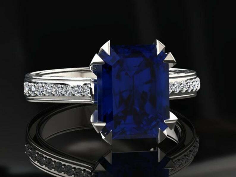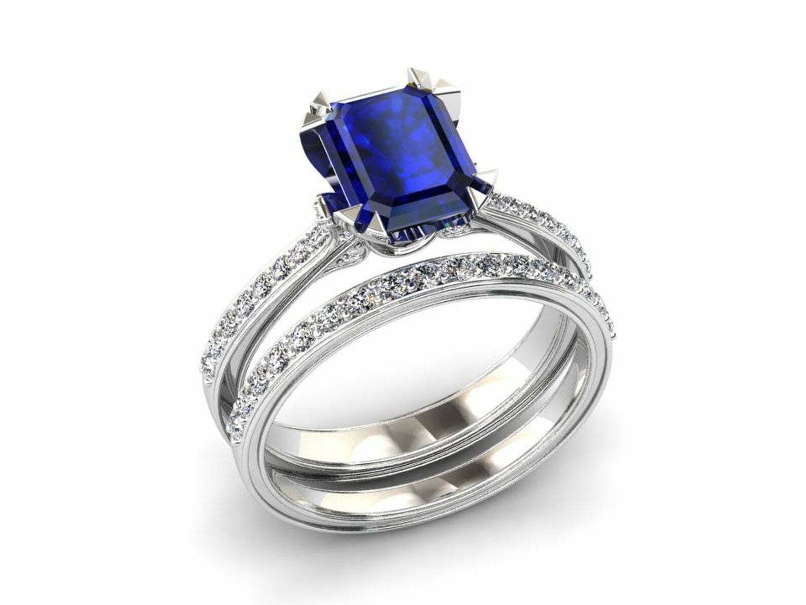 2.7ct Emerald Cut Blue Sapphire Engagement Ring Bridal Set 14k White Gold Finish