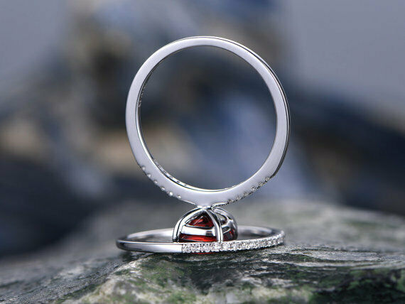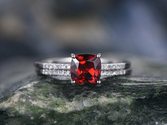 2Ct Cushion Red Garnet Diamond Bridal Set Engagement Ring 14K White Gold Finish