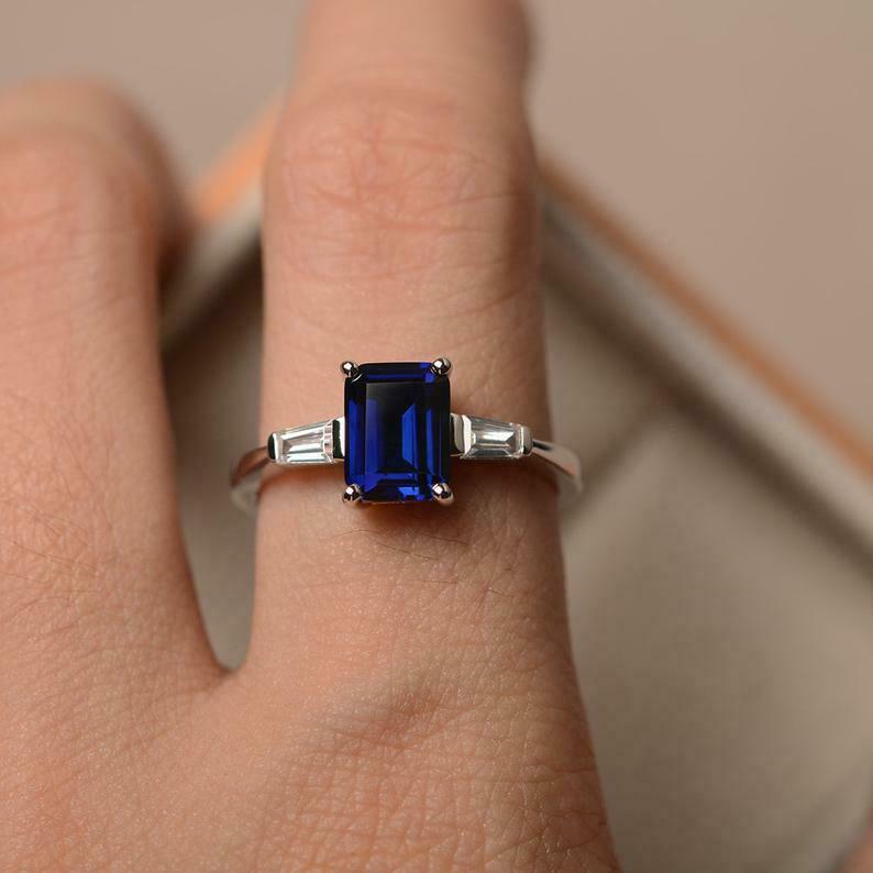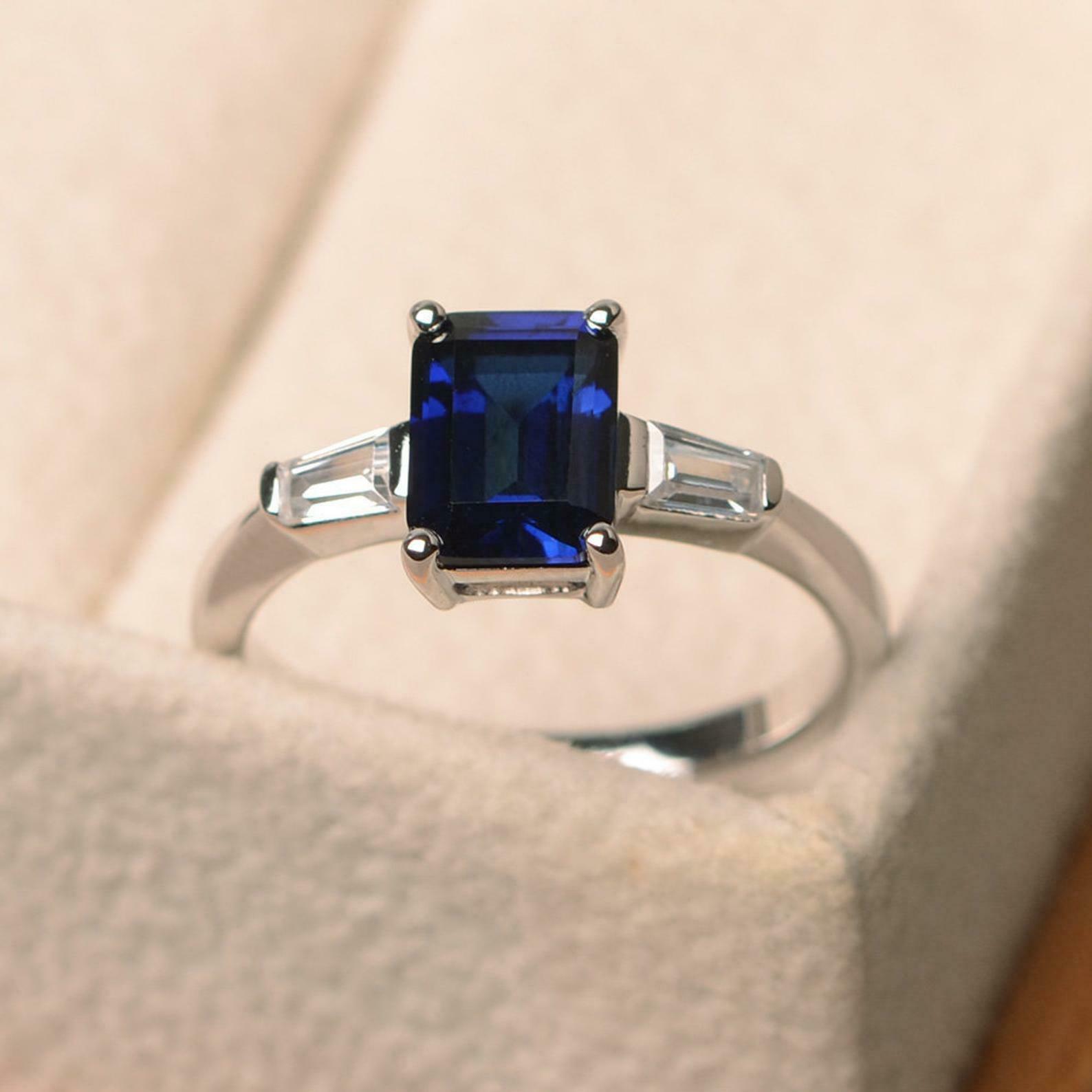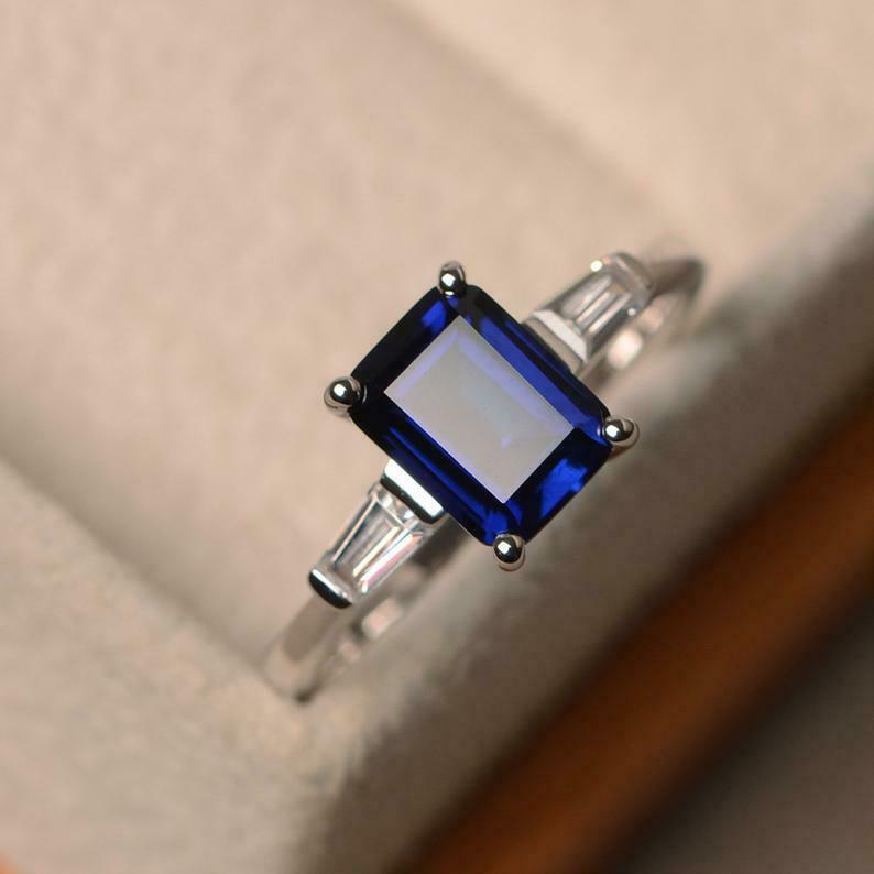 2ct Emerald Cut Blue Sapphire Engagement Ring Three Stone 14k White Gold Finish