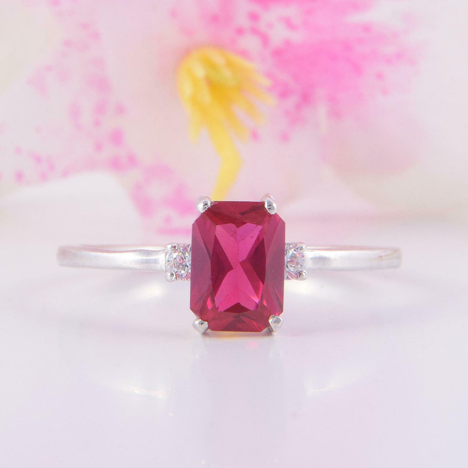 2ct Emerald Cut Pink Ruby Engagement Ring Diamond Trilogy 14k White Gold Finish