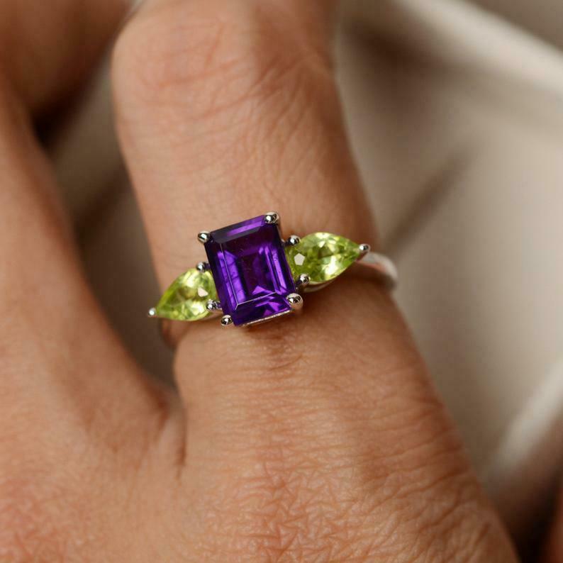 2ct Emerald Cut Purple Amethyst Pear Accents Trilogy Ring 14k White Gold Finish