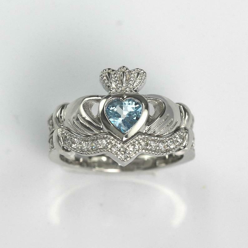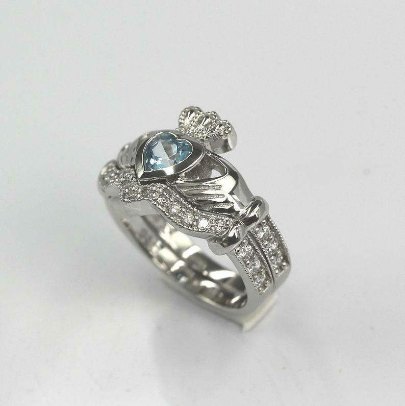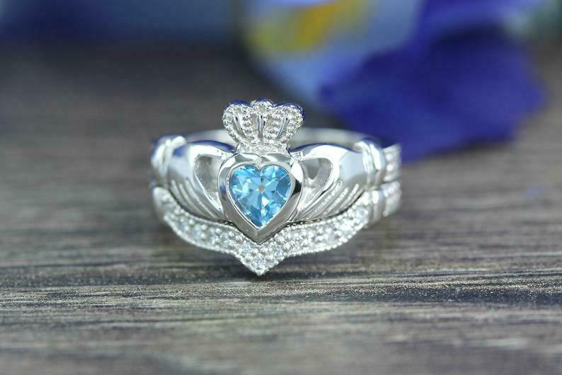 2ct Heart Cut Blue Topaz Engagement Ring Claddagh Bridal Set 14k White Gold Over