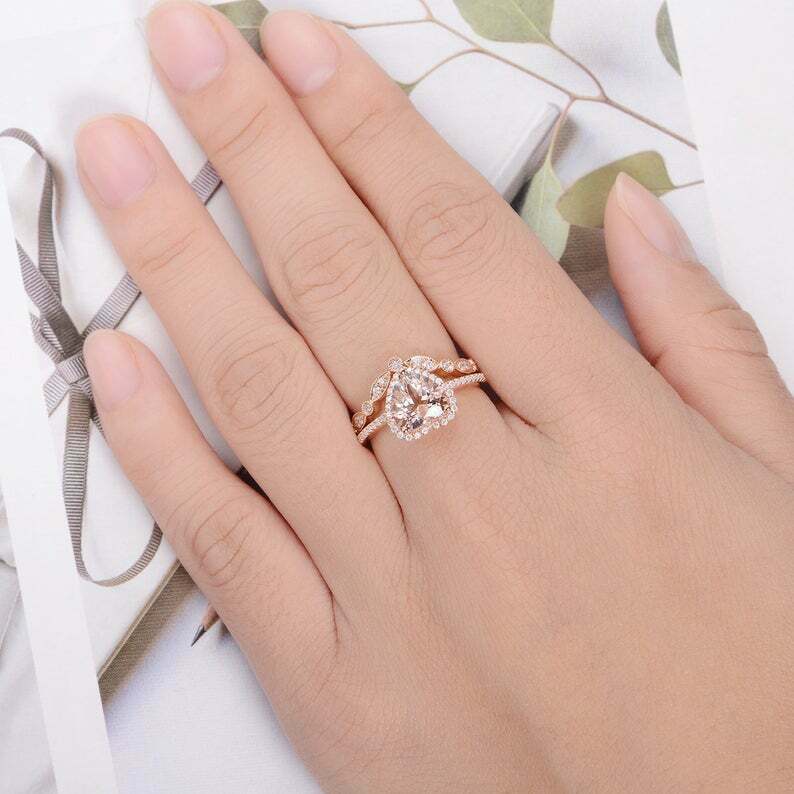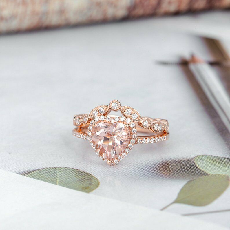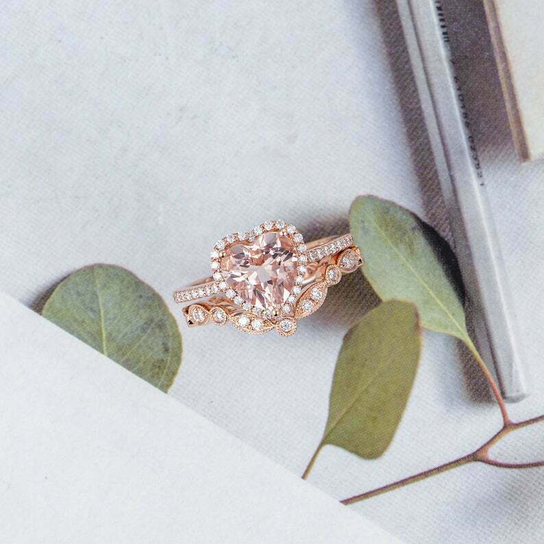 2ct Heart Cut Morganite Diamond Halo Curved Bridal Set Ring 14k Rose Gold Finish