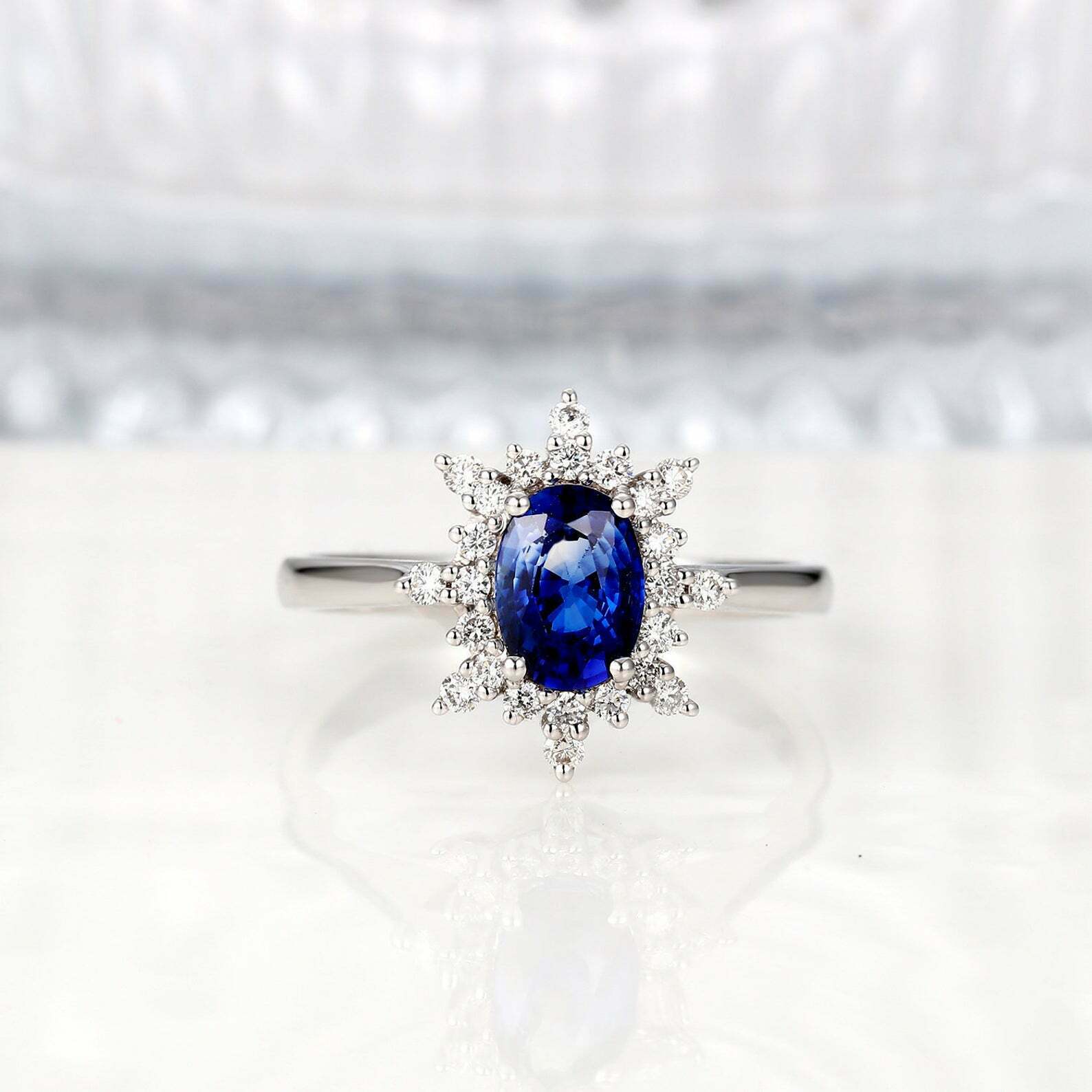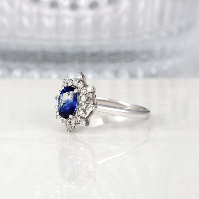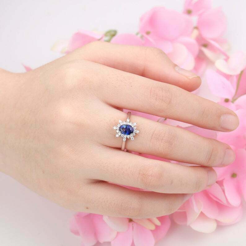 2ct Oval Blue Sapphire Engagement Ring Diamond Halo Flower 14k White Gold Finish