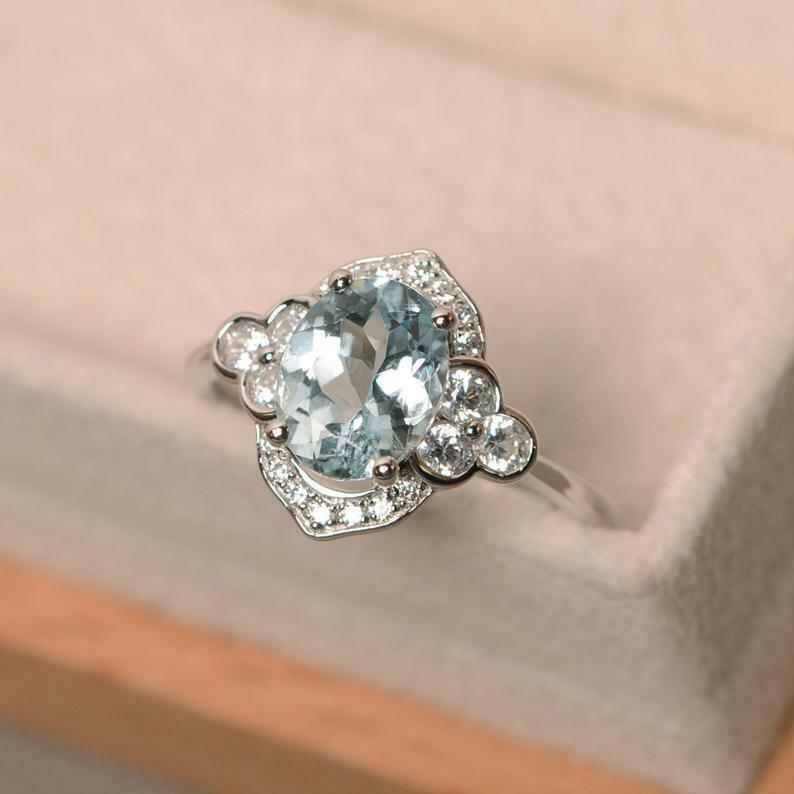 2ct Oval Cut Blue Aquamarine Solitaire Round Floral Halo Ring 14k WhiteGold Over