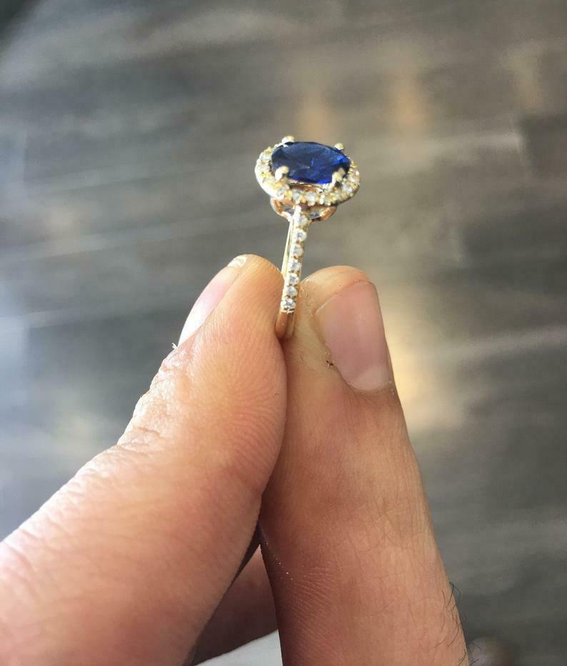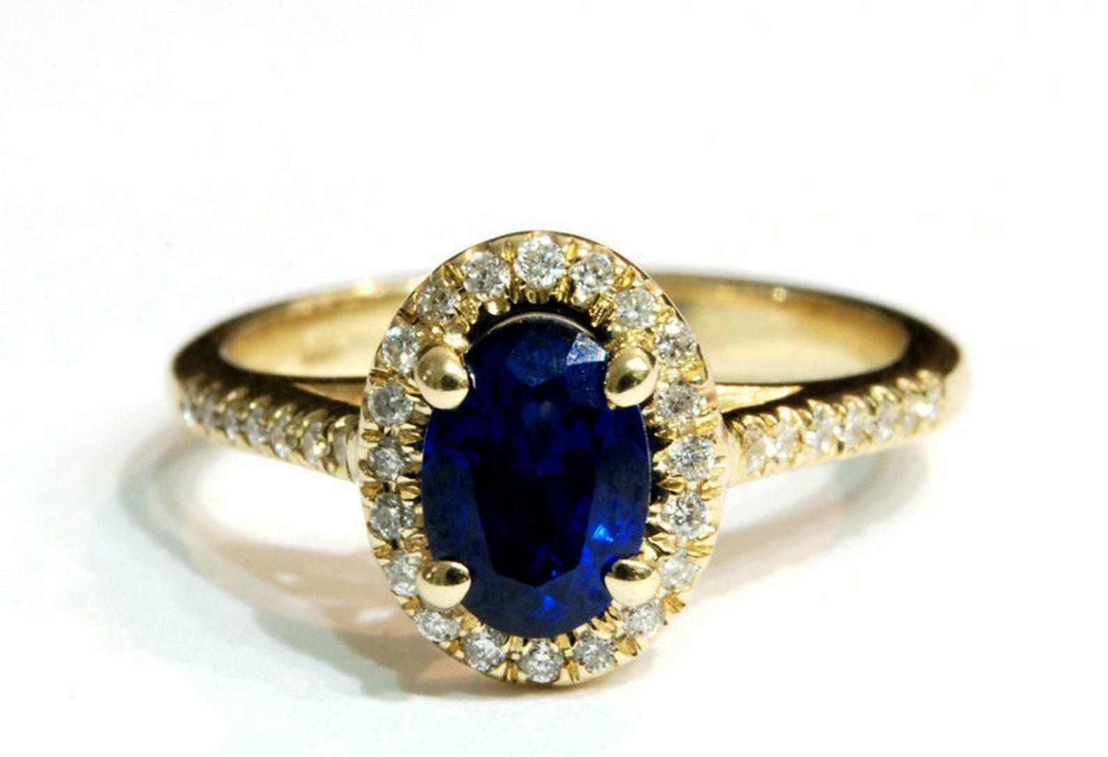 2ct Oval Cut Blue Sapphire Halo Solitaire with Accent Ring 14k YellowGold Finish