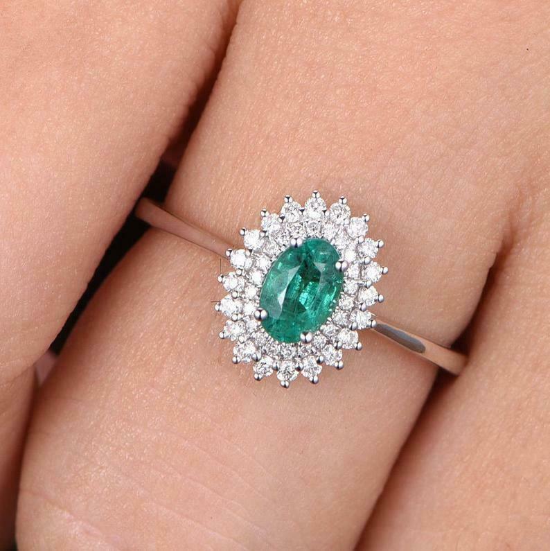 2ct Oval Cut Green Emerald Engagement Ring Dual Halo Floral 14k White Gold Over
