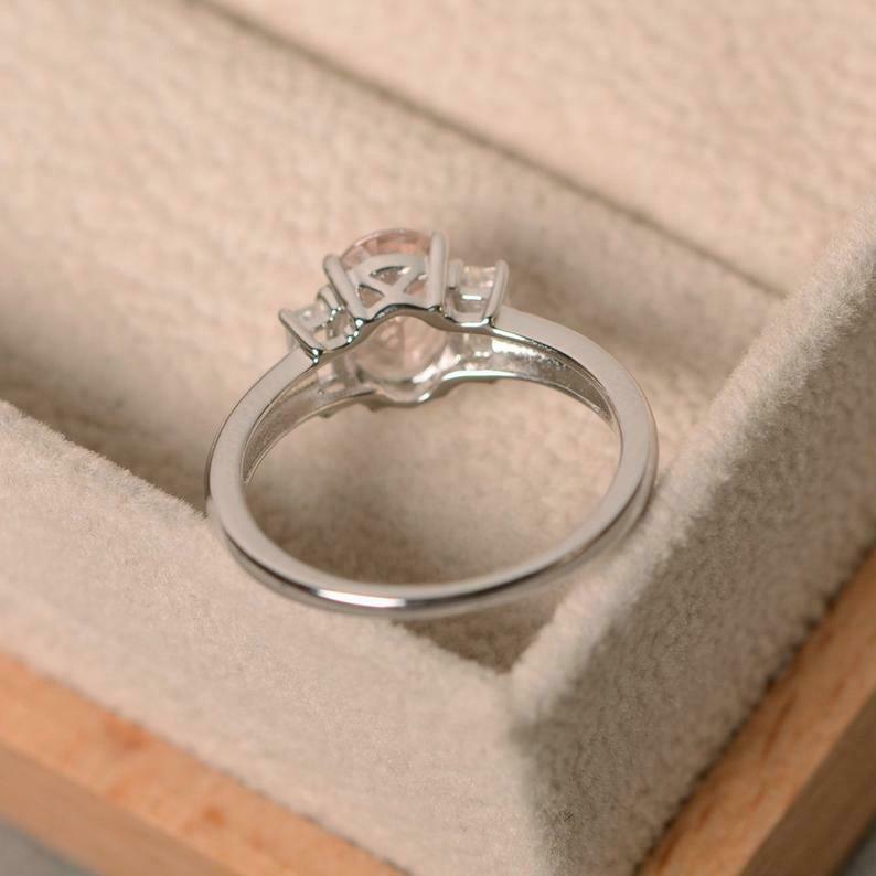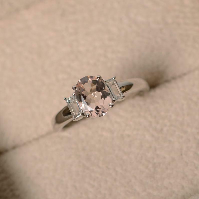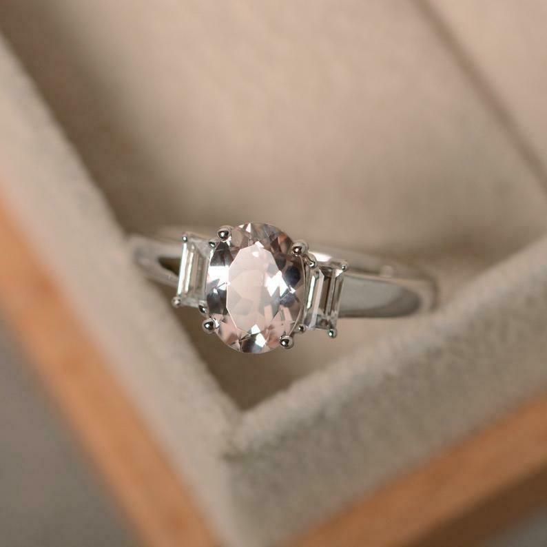 2ct Oval Cut Peach Morganite Baguette Accents Trilogy Ring 14k White Gold Finish