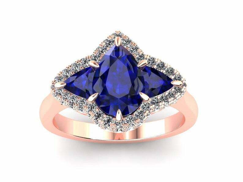 2ct Pear Blue Sapphire Engagement Ring Halo Trilogy Solitaire 14k Rose Gold Over