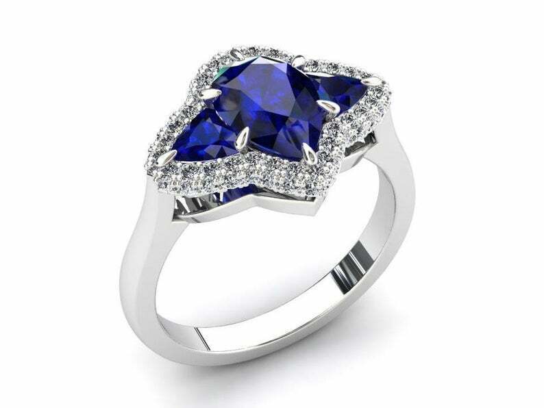 2ct Pear Blue Sapphire Engagement Ring Halo Trilogy Solitaire 14k WhiteGold Over