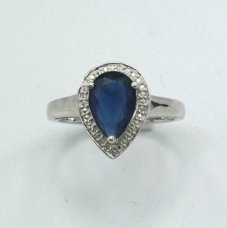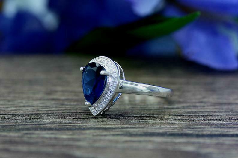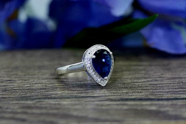 2ct Pear Cut Blue Sapphire Engagement Ring Halo Solitaire 14k White Gold Finish