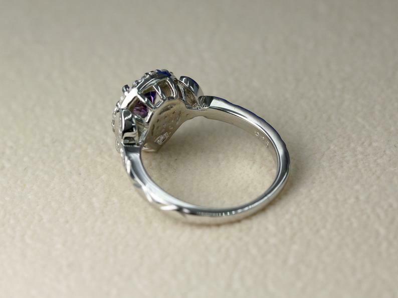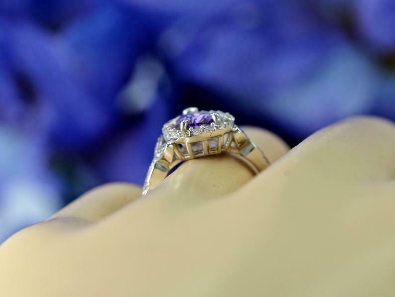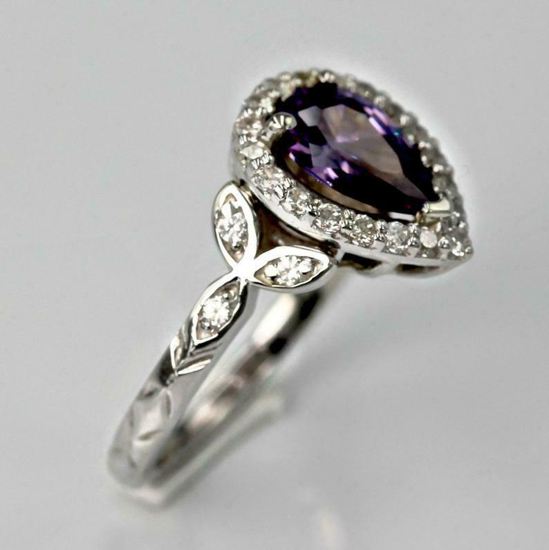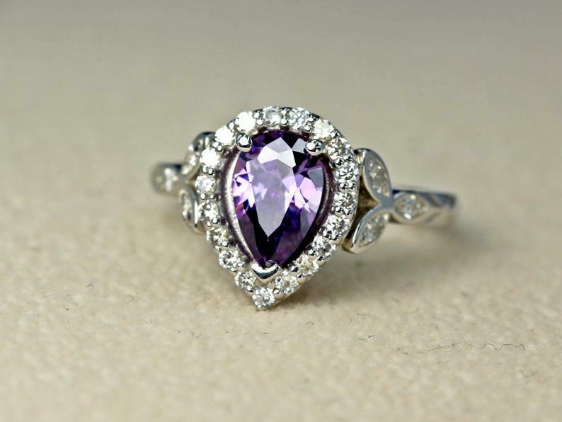 2ct Pear Cut Purple Amethyst Engagement Ring Halo Floral 14k White Gold Finish