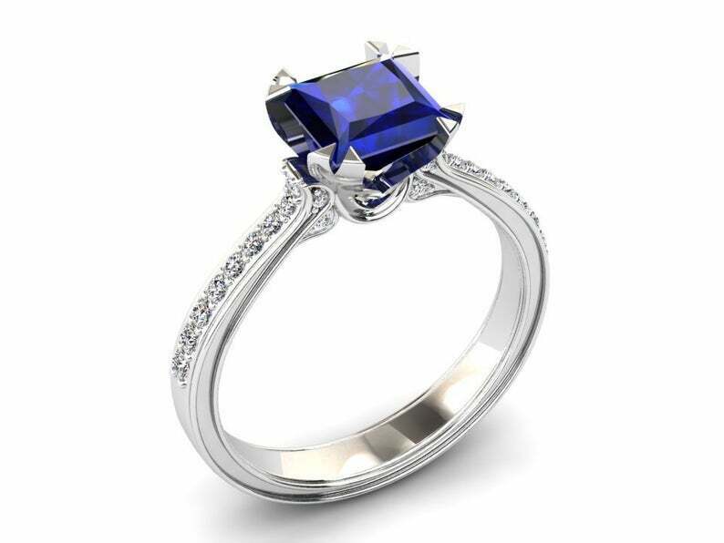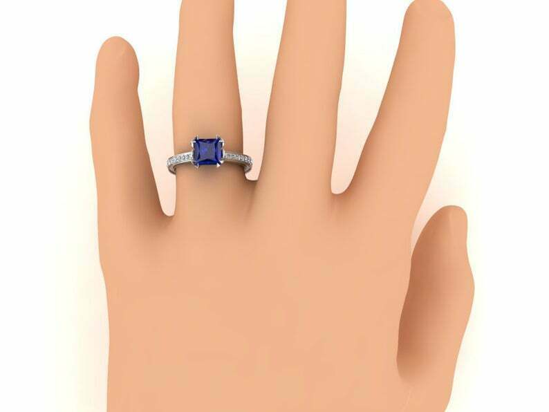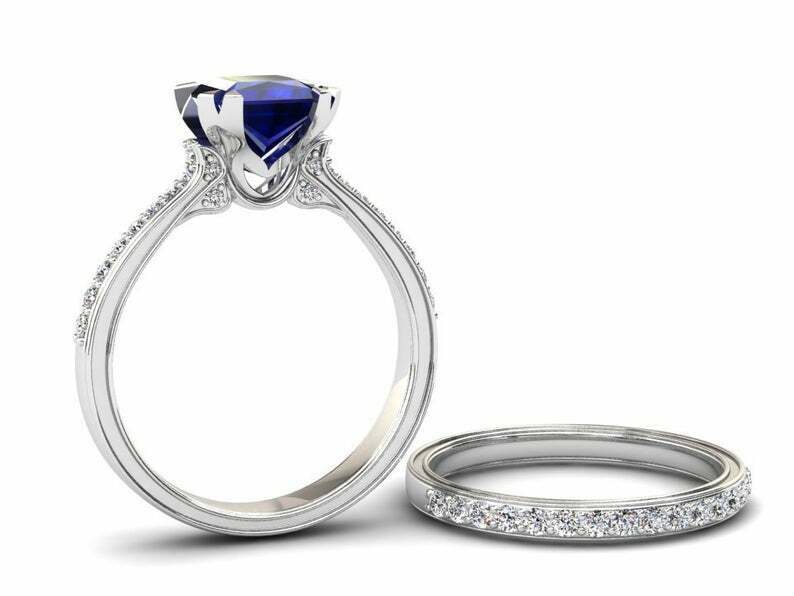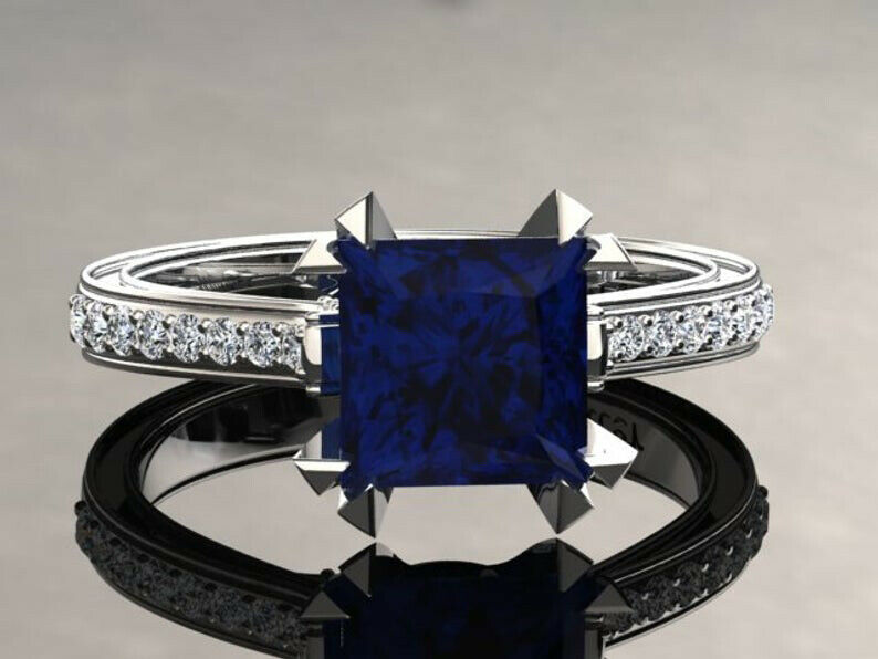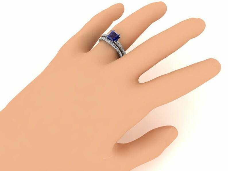 2ct Princess Cut Blue Sapphire Bridal Set Band Engagement Ring 14k White Gold Finish