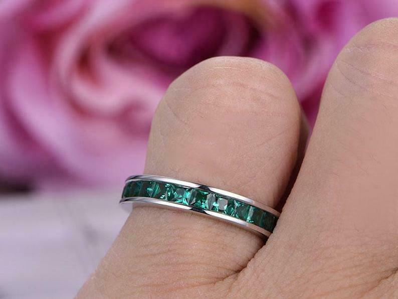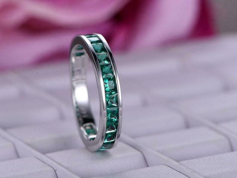 2ct Princess Cut Green Emerald Wedding Band 3/4th Full Eternity 14k White Gold Over