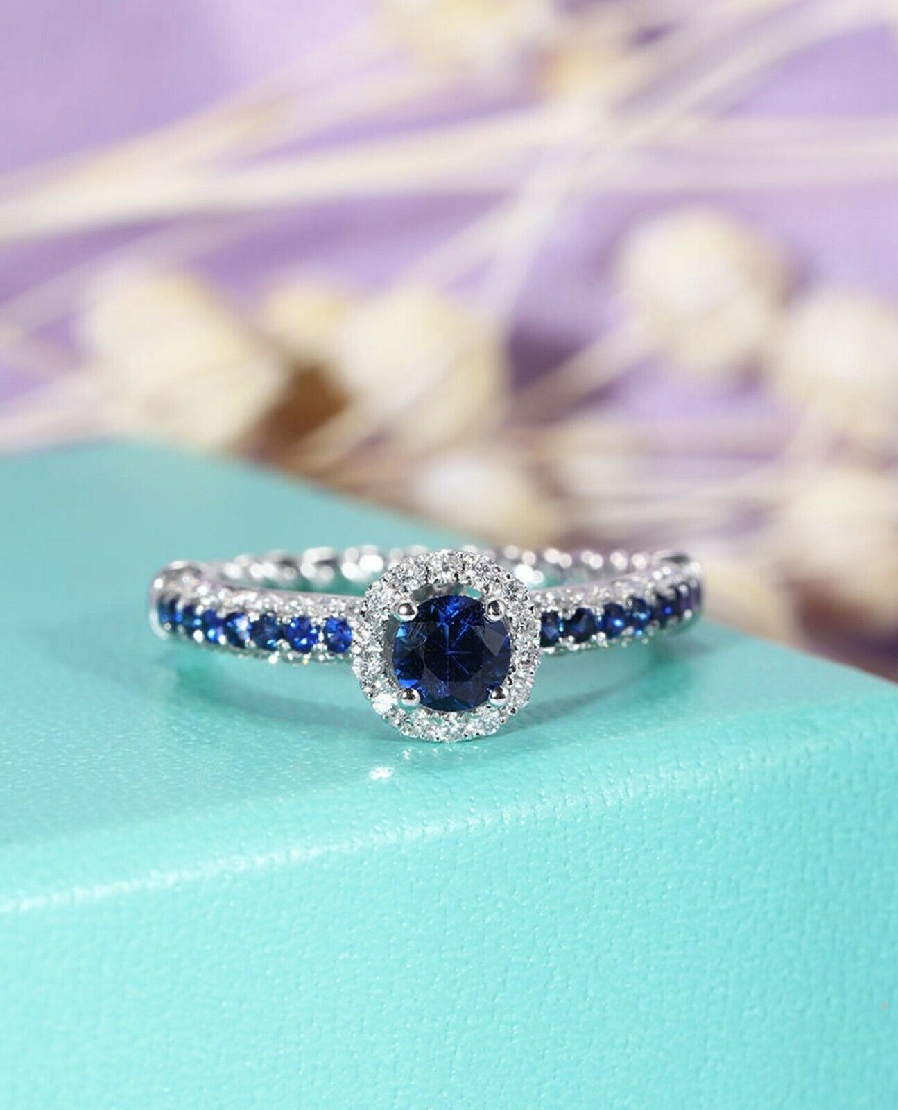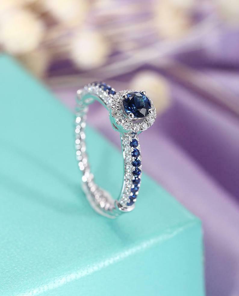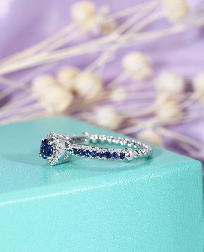 2ct Round Cut Blue Sapphire Engagement Ring Diamond Halo Twisted 14k White Gold Over