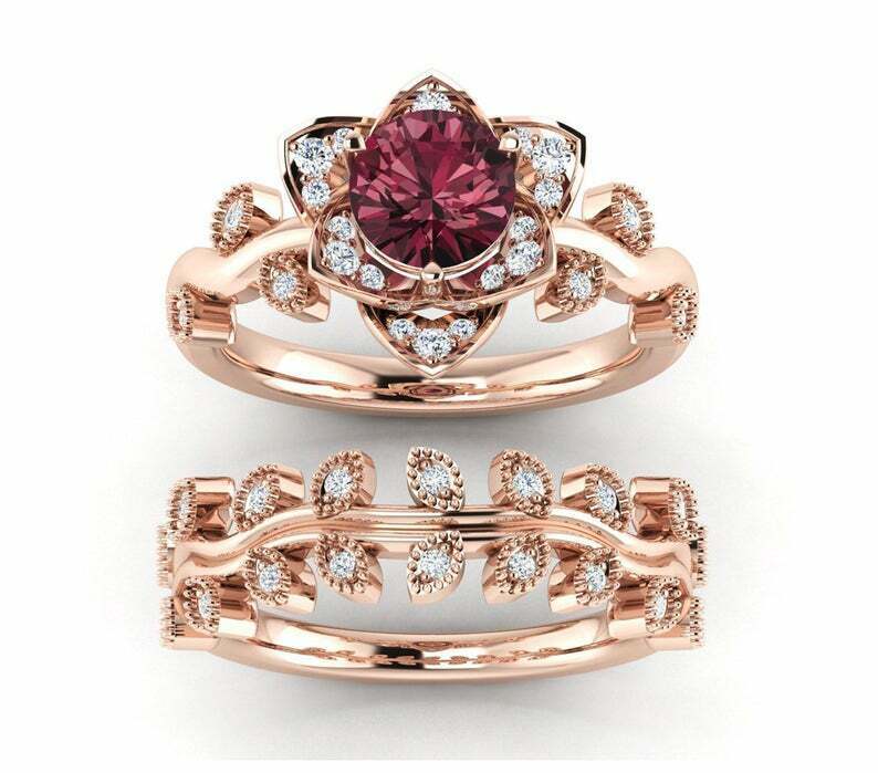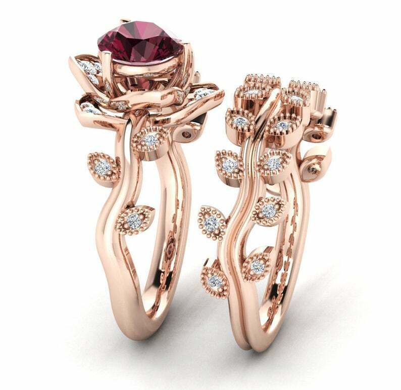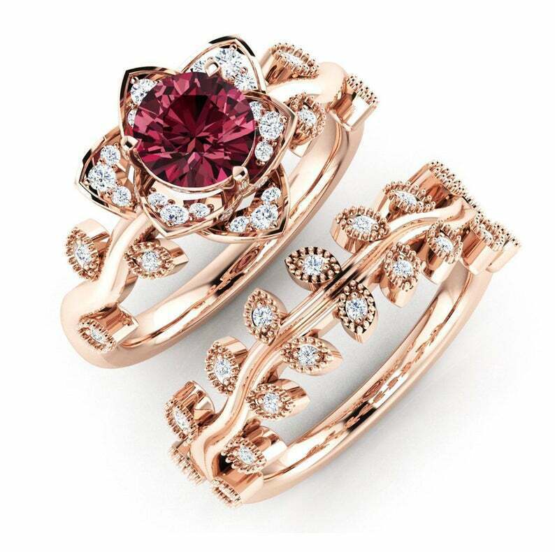 2ct Round Cut Red Garnet Floral Bridal Set Engagement Ring 14k Rose Gold Finish