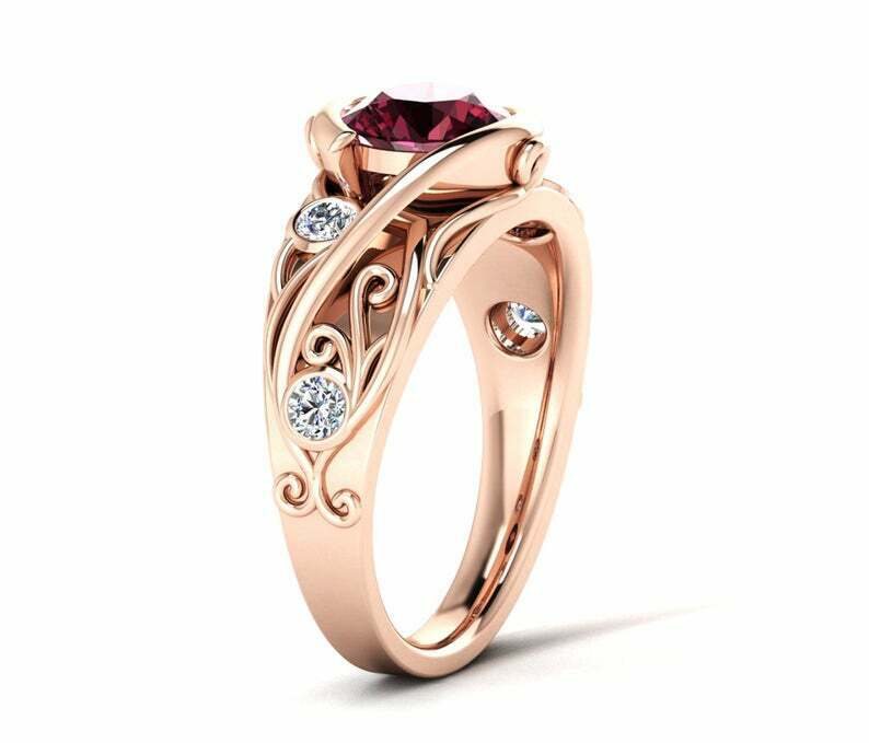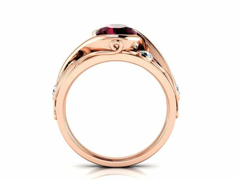 2ct Round Cut Red Garnet Leaf Vine Solitaire Round Accent Ring 14k Rose Gold Over