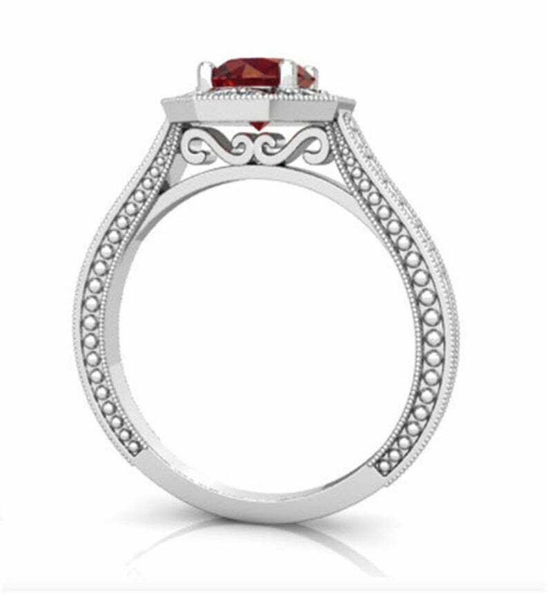 2ct Round Cut Red Garnet Vintage Inspired Starburst Ring 14k White Gold Finish