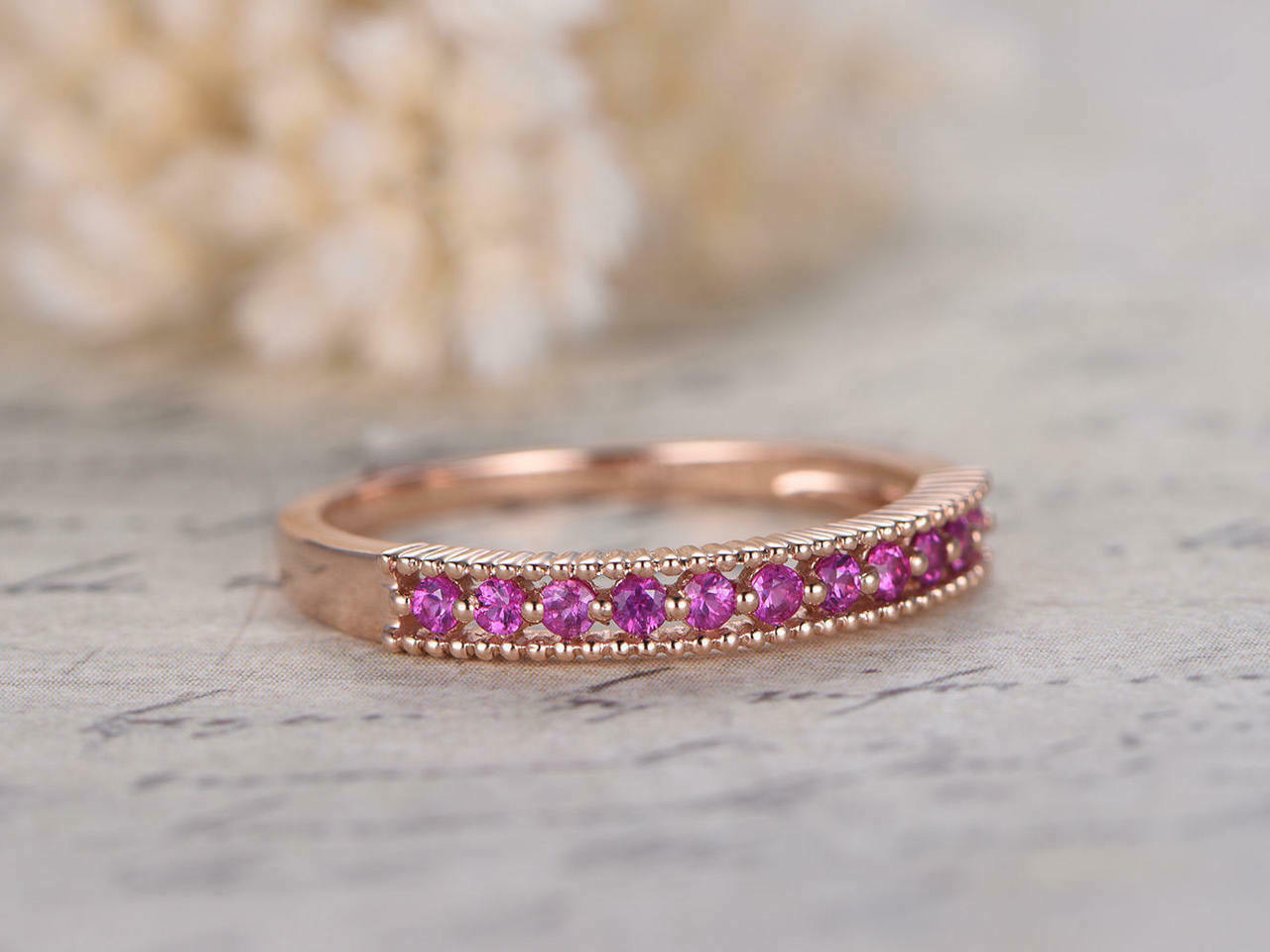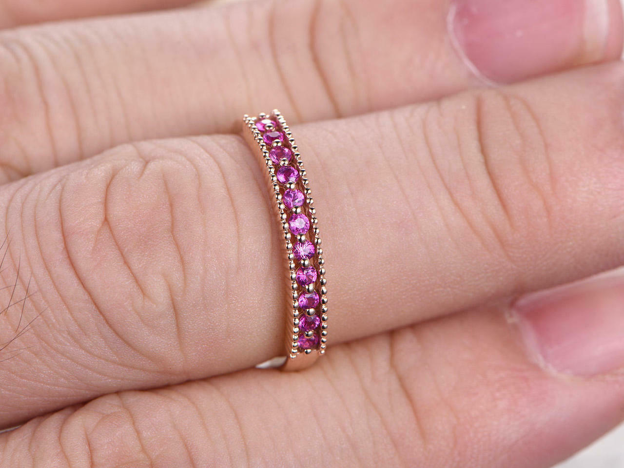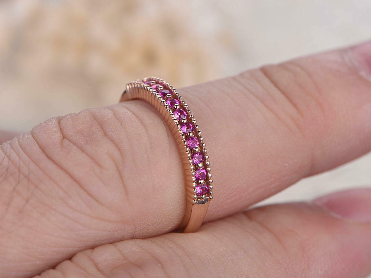 2ct Round Cut Pink Sapphire Wedding Band Milgrain Half Eternity 14k Rose Gold Finish