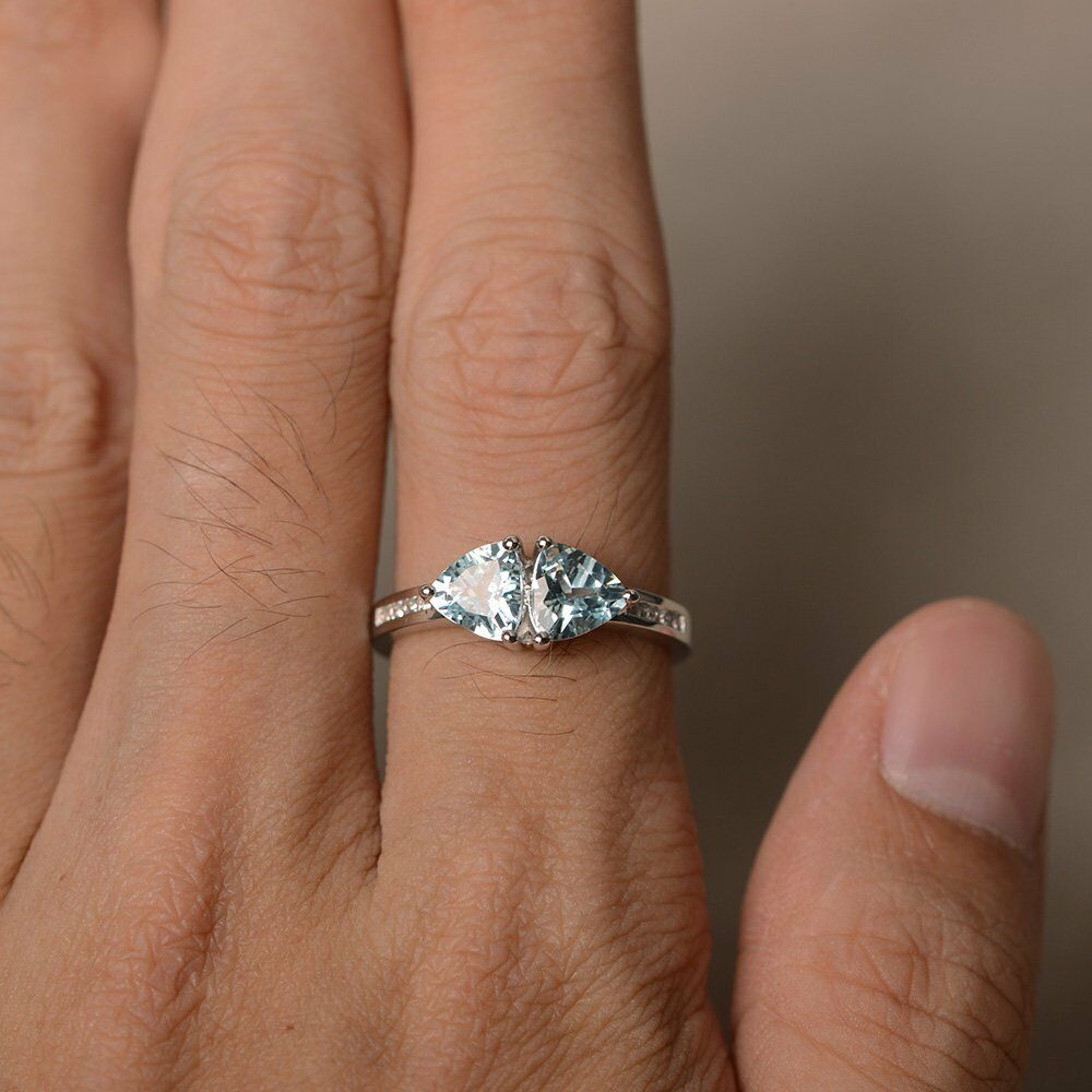 2ct Trillion Cut Blue Aquamarine Two Stone Engagement Ring 14k White Gold Finish