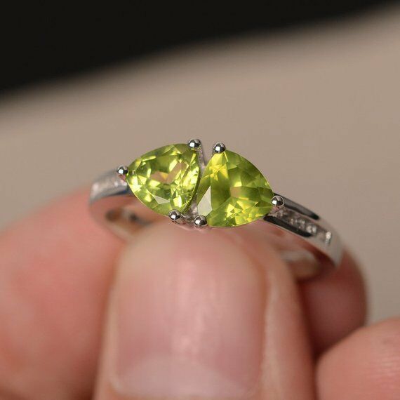 2ct Trillion Cut Green Peridot Two Stone Engagement Ring 14k White Gold Finish