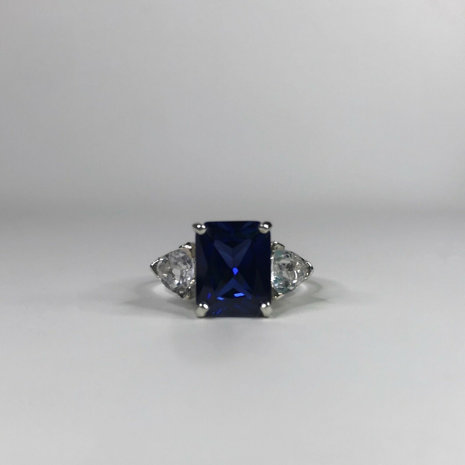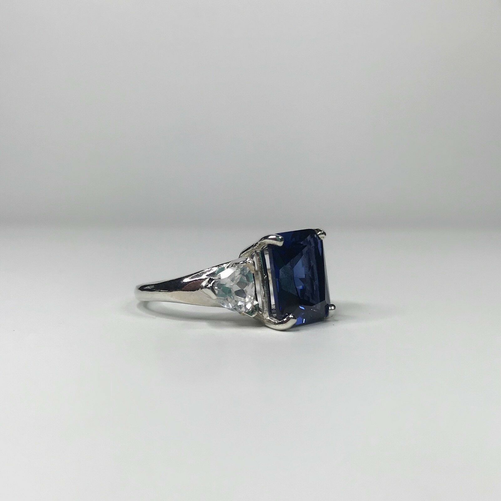 2ct Trillion Diamond Blue Sapphire Trilogy Engagement Ring 14k White Gold Finish