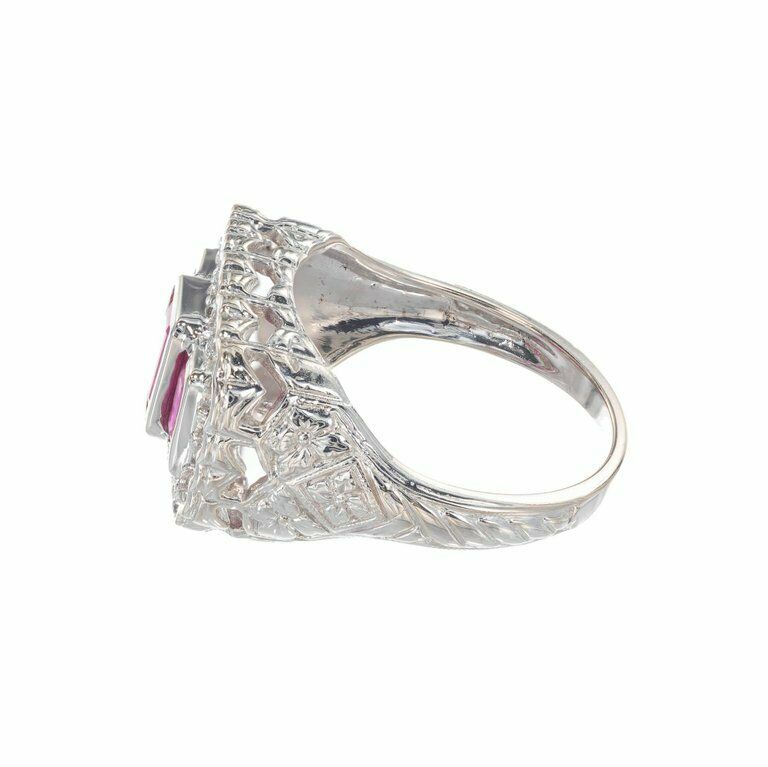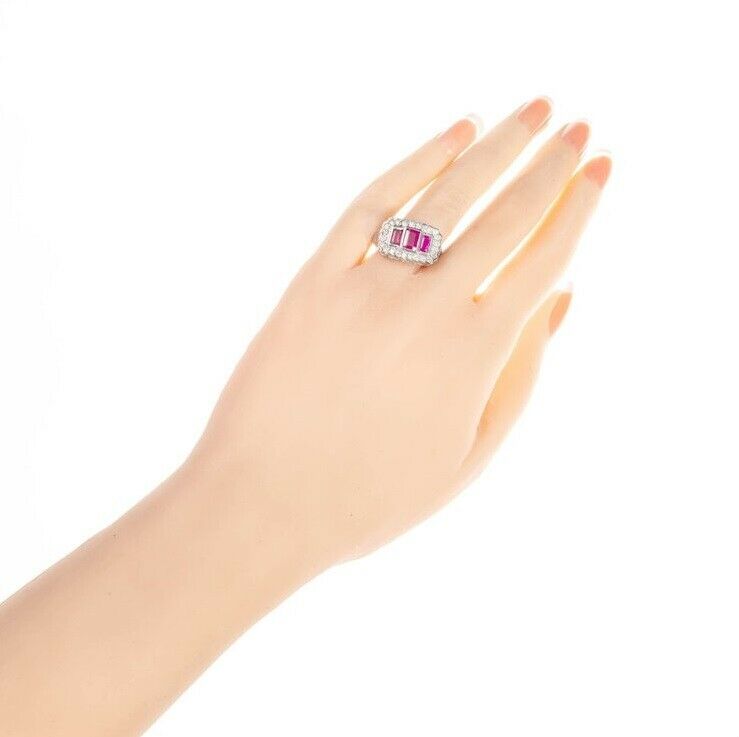 3ct Emerald Cut Pink Ruby Engagement Ring Halo Unique Trilogy 14k White Gold Finish