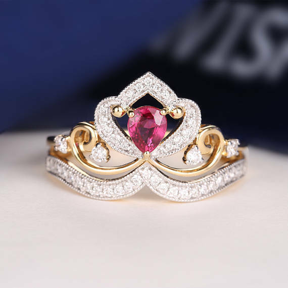 3ct Pear Cut Pink Ruby Engagement Ring 14k Yellow Gold Finish Queen Crown Bridal