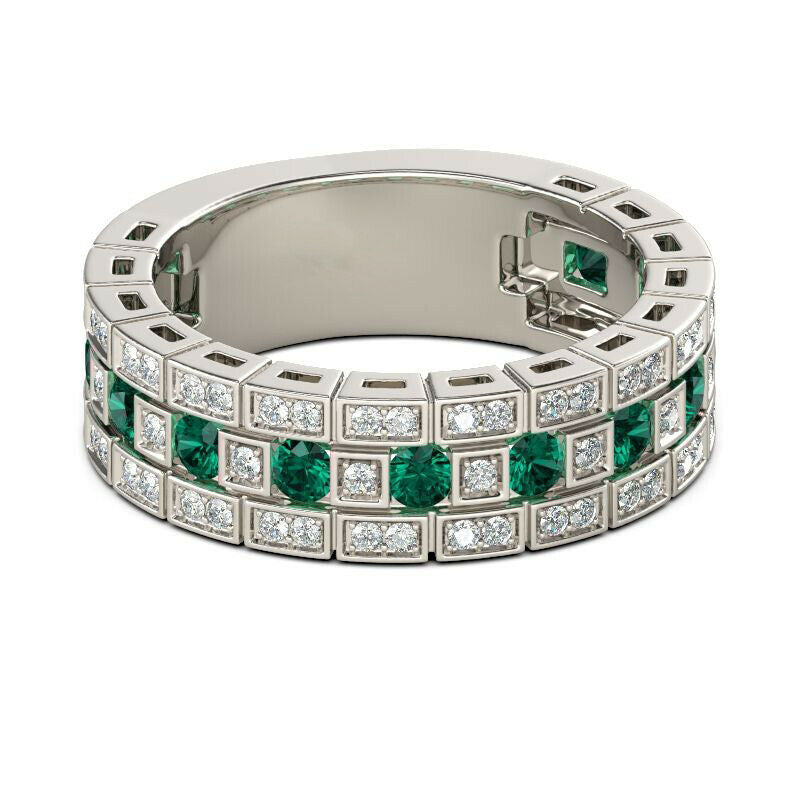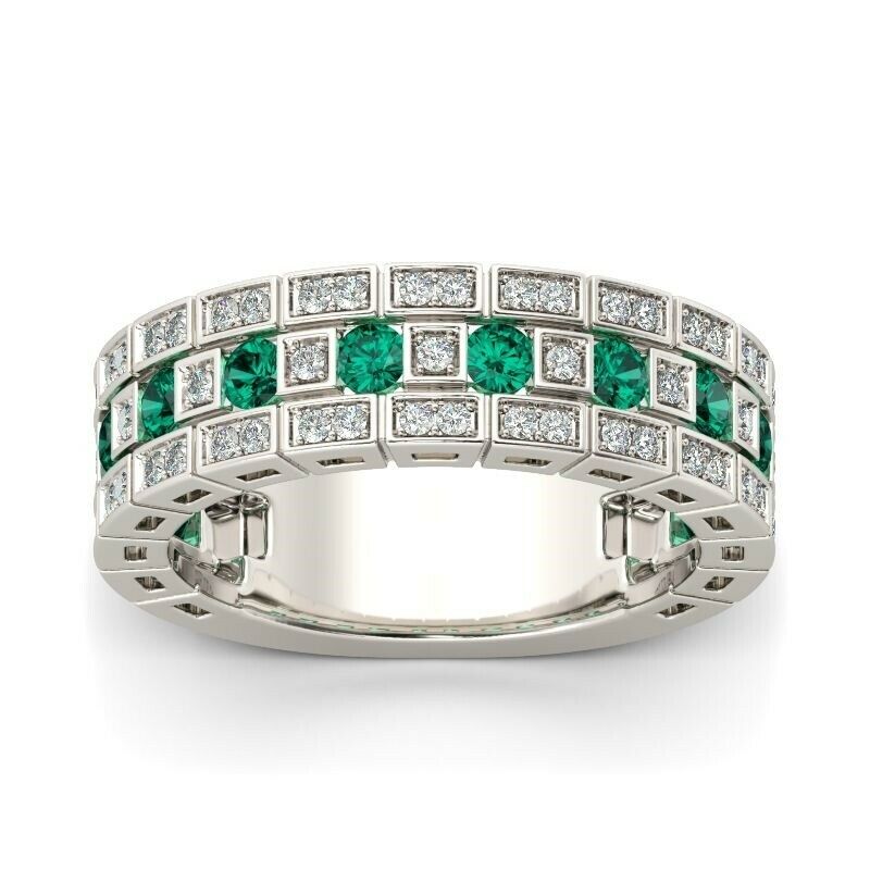 3Ct Round Cut Green Emerald Diamond Cubes Wedding Band Ring 14K White Gold Over
