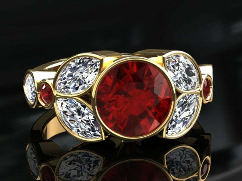 3ct Round Cut Red Ruby Engagement Ring Leaf Marquise Accent 14k Yellow Gold Over