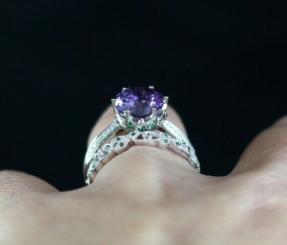 3Ct Round Purple Amethyst Emerald Vintage Band Bridal Set 14K White Gold Finish