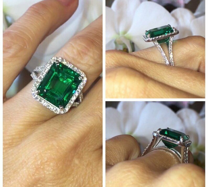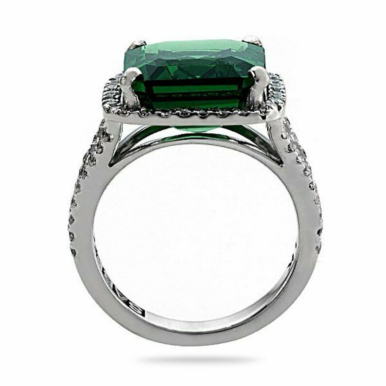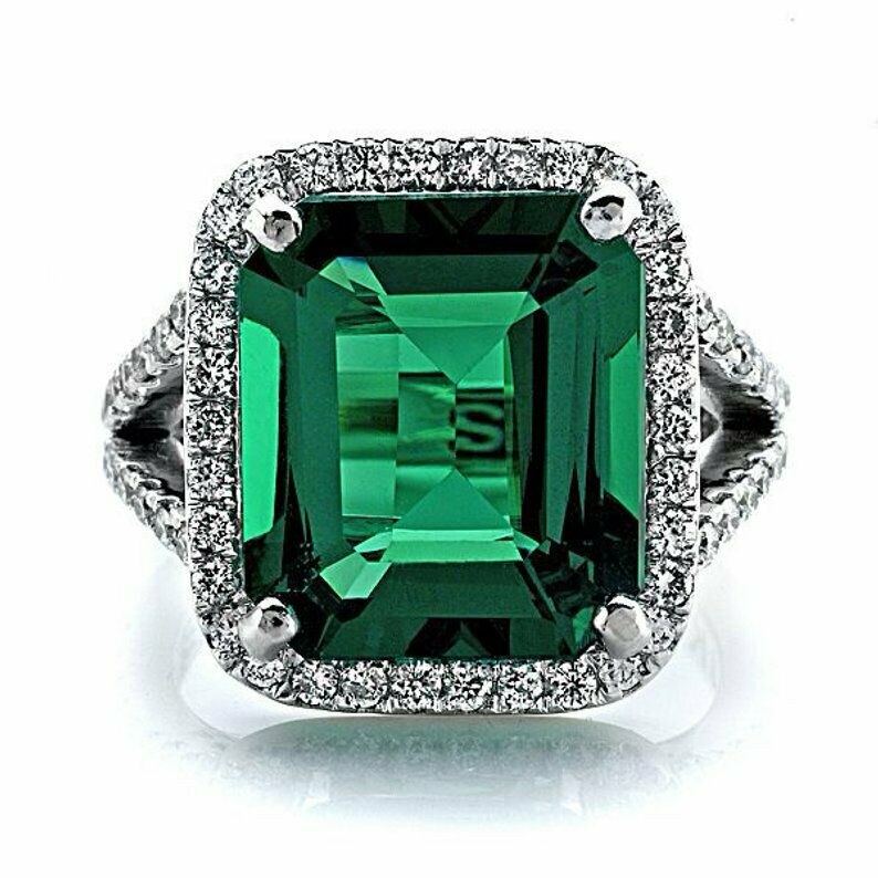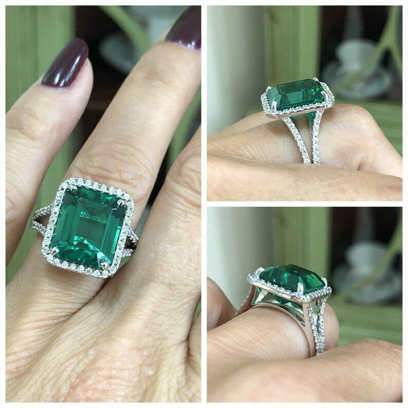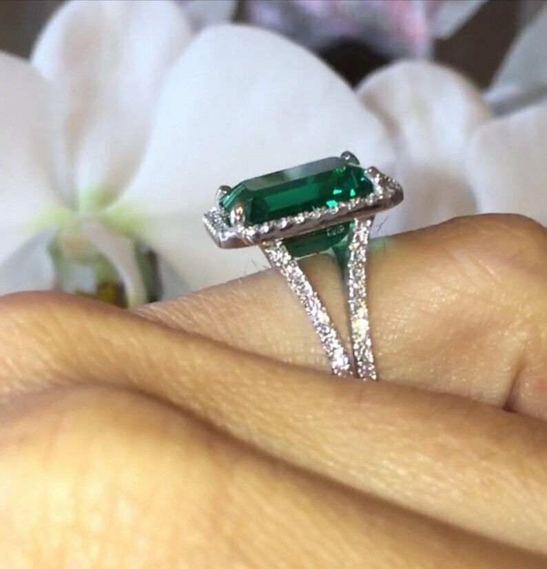 4ct Green Emerald Engagement Ring Diamond Halo Split Shank 14k White Gold Finish
