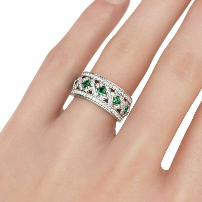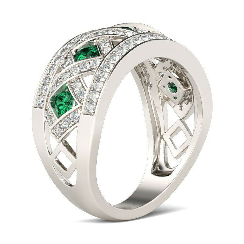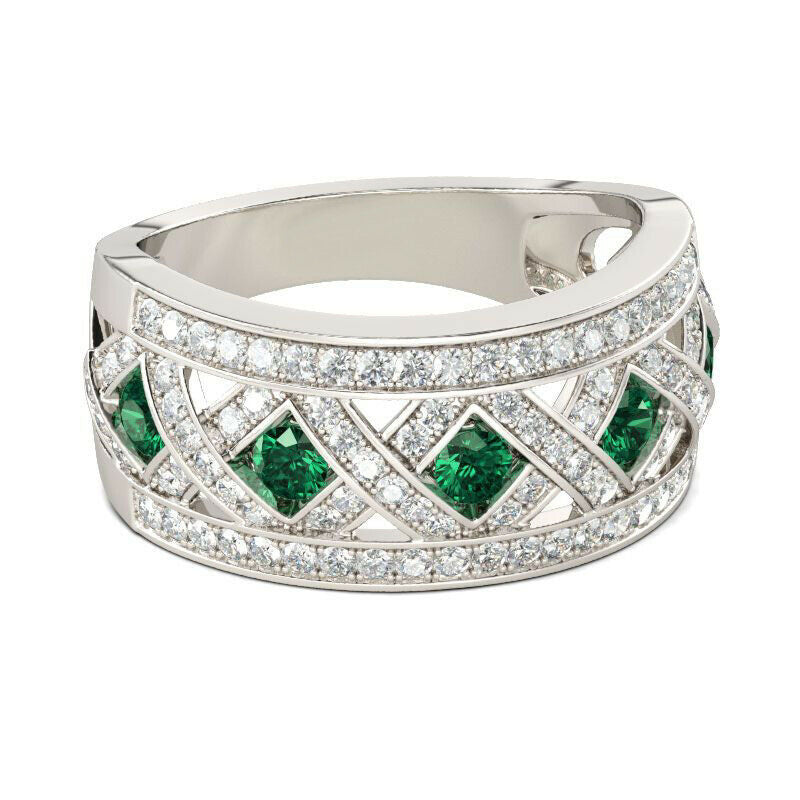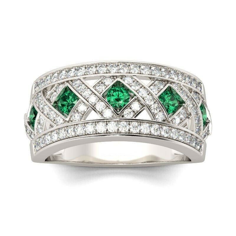 4Ct Round Cut Green Emerald Diamond Square Wedding Band Ring 14K White Gold Over